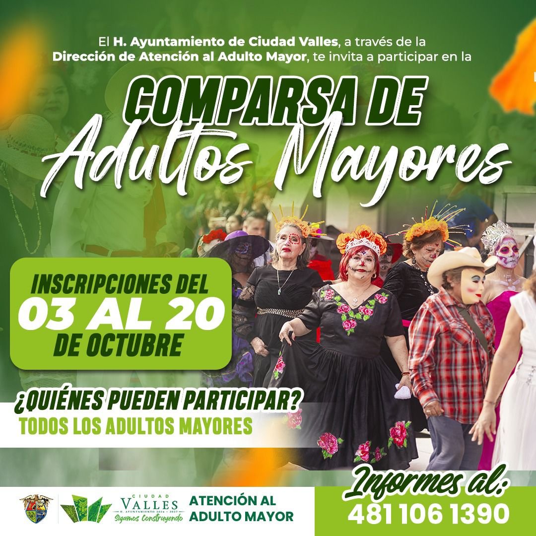 👺 La Dirección de Atención al Adulto Mayor, del H. Ayuntamiento de Ciudad Valles, invita a participar en la Comparsa de Adultos Mayores.