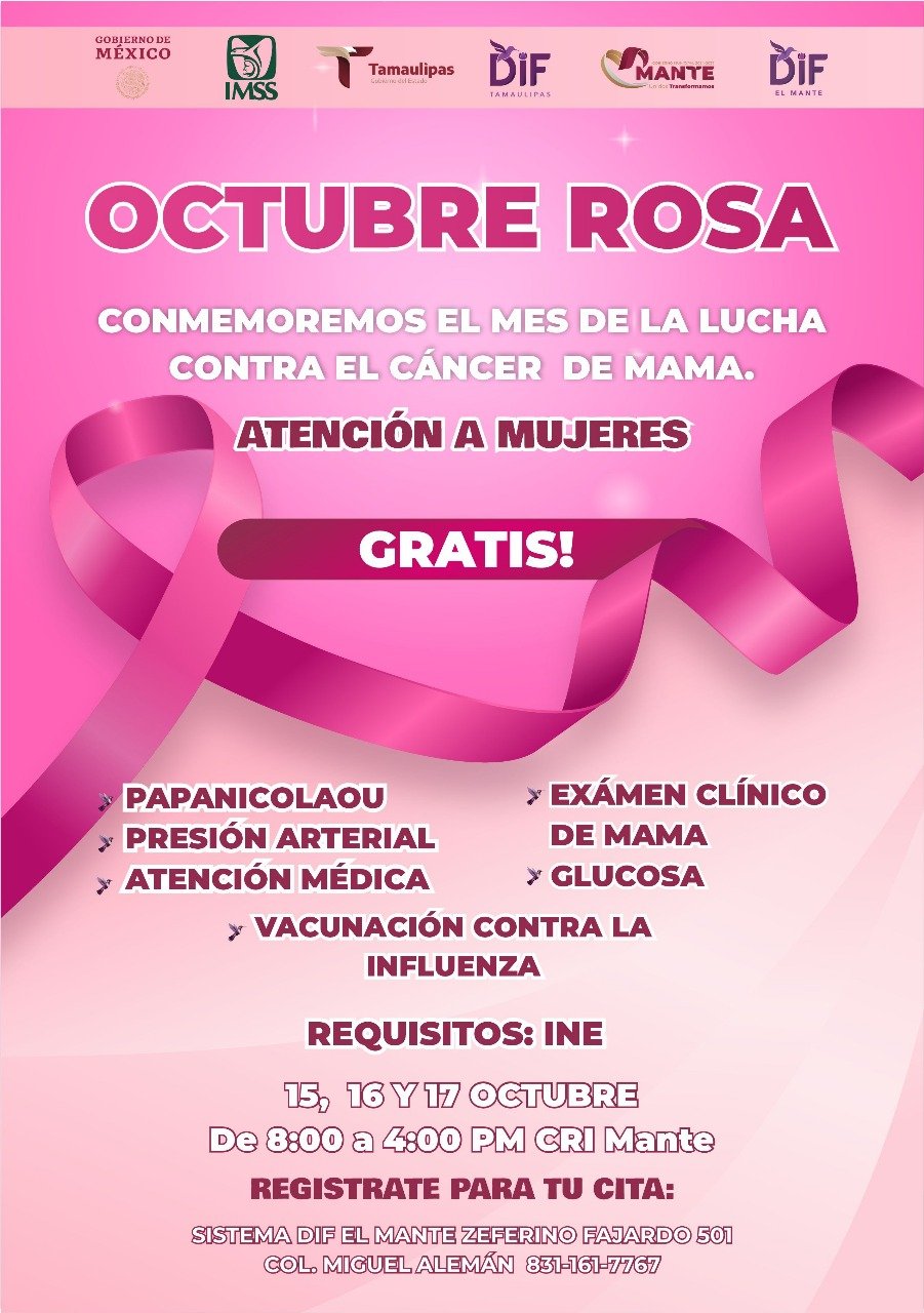 *El sistema DIF El Mante realizará campaña gratuita para detección oportuna de cáncer de mama los días 15, 16 y 17 de octubre.