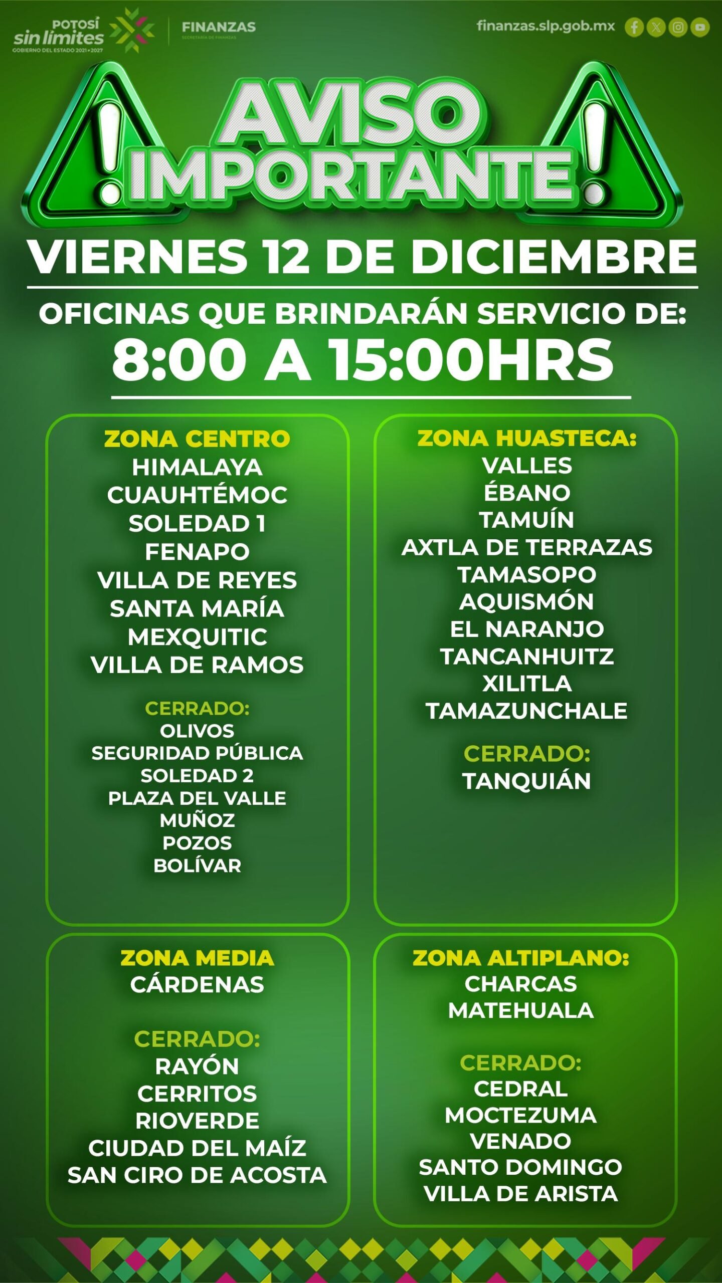 En cumplimiento con la instrucción del Gobernador Ricardo Gallardo Cardona de garantizar atención continua y cercana a la ciudadanía, la Secretaría de Finanzas de Gobierno del Estado (Sefin) informa que 21 oficinas recaudadoras permanecerán abiertas el viernes 12 de diciembre, operando en un horario de 8:00 a 15:00 horas.