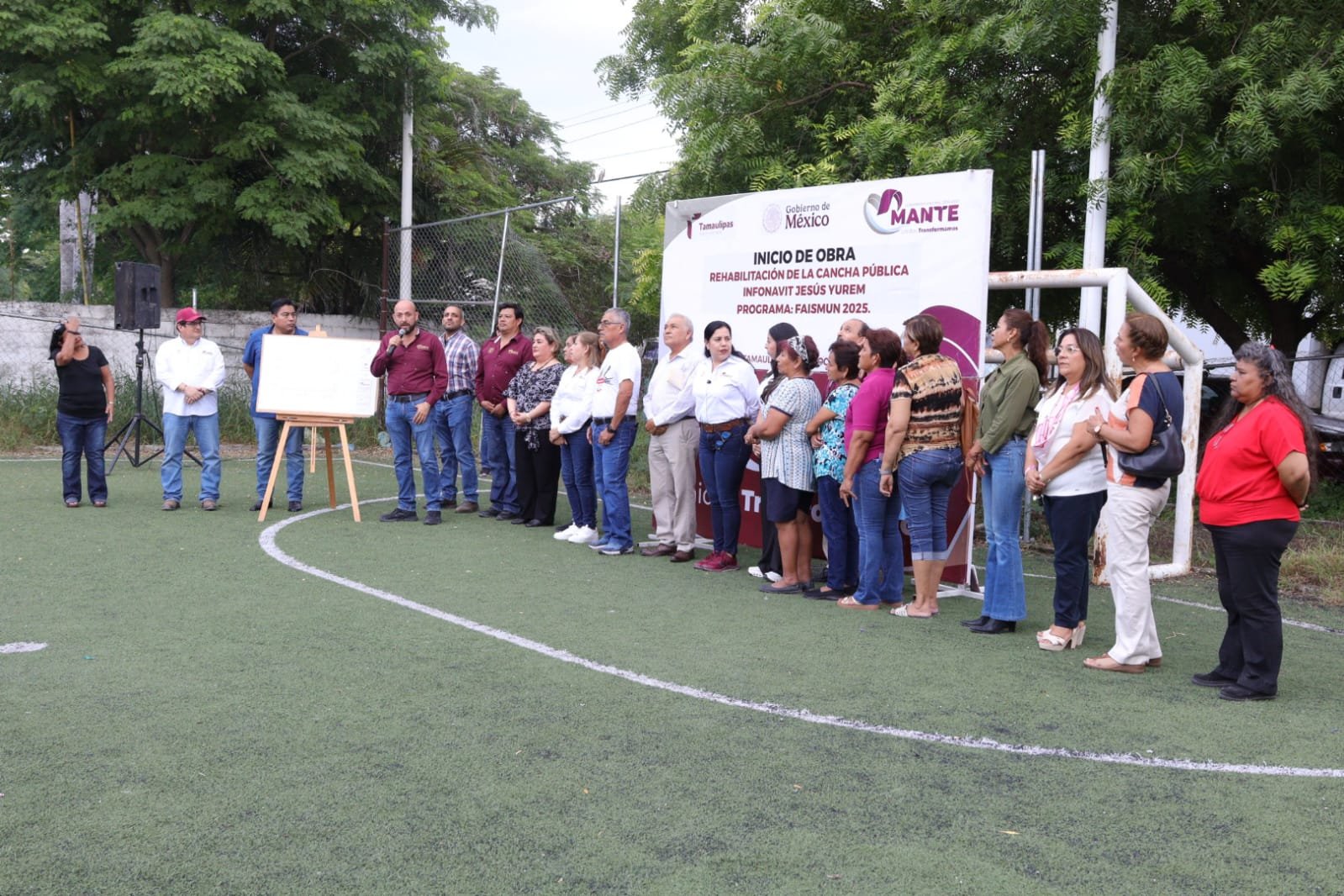 Con beneficio directo a las familias de las colonias Aurora, Valle del Mante y El Músico, se dio el arranque a la obra de recuperación de la cancha de pasto sintético en la colonia Jesús Yurem, donde Francisco Báez, presidente del Consejo de Colaboración Vecinal, reconoció el interés del Gobierno Municipal por rescatar este espacio público que se mantuvo olvidado por varios años.