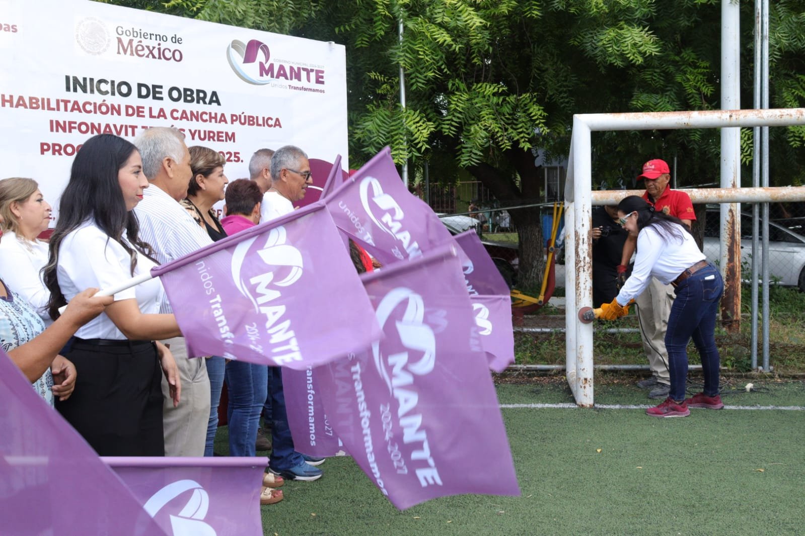 * En las colonias Yurem y Santa Mónica se dio el banderazo de arranque para la rehabilitación de laa canchas de pasto sintético, espacios de convivencia que apoyan el rescate del tejido social.