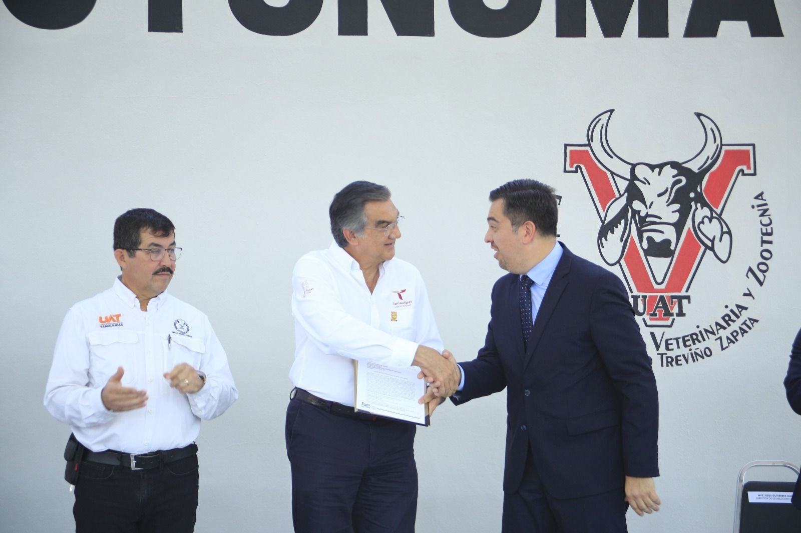 Octubre 28 de 2025 Ciudad Victoria, Tamaulipas.- El gobernador Américo Villarreal Anaya recibió la ampliación de la certificación Tipo Inspección Federal (TIF) para la operación del rastro de la Universidad Autónoma de Tamaulipas (UAT), lo que convierte a la UAT en el único centro universitario de todo el país en contar con este documento que expide el Servicio Nacional de Sanidad, Inocuidad y Calidad Agroalimentaria (Senasica). Acompañado por el rector de la UAT, Dámaso Anaya Alvarado, y dirigentes del sector ganadero del estado, el gobernador recibió de manos de Leandro David Soriano García, director general de Inocuidad Agroalimentaria, Acuícola y Pesquera del Senasica, el documento que permite la actividad diaria de la sala de corte y deshuese para la especie bovina, cámara de producto terminado, almacén, empaque y andenes de carga y descarga en el rastro ubicado en la Facultad de Medicina Veterinaria y Zootecnia, en esta capital.“En Tamaulipas estamos haciendo historia, y aquí está la constancia de que se puede trabajar en conjunción para buscar mejores oportunidades y niveles de bienestar para todos”, dijo el mandatario tamaulipeco. Y agregó: “Me da mucho gusto recibir este certificado, claro, en compañía del rector, el doctor Dámaso Anaya, en donde también nos hacen la especificación de que es la primera escuela de Veterinaria de la Universidad Autónoma de Tamaulipas que cuenta con un certificado TIF. Así es que enhorabuena a la Universidad Autónoma por ser la primera en México en tener un certificado de esta naturaleza”. Villarreal Anaya hizo un llamado para que, con el apoyo de Senasica y de la universidad, y con el propósito de seguir impulsando las fortalezas y vocaciones del estado y poderlas desarrollar en beneficio de quienes menos tienen, próximamente se pueda contar también con un rastro de pequeñas especies, para que los productores de Tamaulipas, de cabritos y de bovinos, puedan tener la oportunidad de incorporarse a este modelo y darle valor agregado a su producción. Al destacar el apoyo del gobernador para impulsar el desarrollo de proyectos productivos de la Universidad Autónoma de Tamaulipas, el rector Dámaso Anaya reconoció que, cuando se unen los esfuerzos del Gobierno, la universidad y el sector productivo, se puede consolidar la transformación del estado. “Mi gratitud sincera al doctor Américo Villarreal, gobernador constitucional de Tamaulipas, por creer en la educación como la herramienta más poderosa para cambiar el destino de nuestra tierra. Gracias, señor gobernador, por impulsar políticas que faciliten la innovación, por fortalecer la infraestructura universitaria y por entender que el futuro de Tamaulipas se construye con ciencia, con tecnología y con humanidad”, expresó. En representación de Francisco Calderón Elizalde, director en jefe de Senasica, el director general de esta dependencia federal, Leandro David Soriano García, explicó que, con esta certificación, el rastro de la UAT garantiza el cumplimiento de la normativa aplicable relacionada con el bienestar animal, adoptando protocolos que aseguran un trato digno a los animales durante su sacrificio, así como las buenas prácticas de manufactura implementadas durante la transformación de los bienes de origen animal destinados al consumo humano, garantizando que la carne que llega a las mesas de la población, a las carnicerías y a los mercados cumple con los más altos estándares de higiene y sanidad. Agregó que este proyecto favorece el desarrollo del estado, mejora la economía en la región y fortalece la cadena productiva, además de abrir las puertas para que la carne producida en la Universidad Autónoma de Tamaulipas compita no solo a nivel nacional, sino también a nivel internacional, cumpliendo con estándares aún más exigentes. En el evento también estuvieron presentes Héctor Joel Villegas, secretario general de Gobierno; Antonio Varela Flores, secretario de Desarrollo Rural, Pesca y Acuacultura; José Guerrero Gamboa, presidente de la Unión Ganadera Regional de Tamaulipas; el diputado Francisco Hernández Niño; y Jesús Gutiérrez García, director de Establecimientos TIF, además de funcionarios de la Universidad Autónoma de Tamaulipas y directivos y estudiantes de la Facultad de Medicina Veterinaria y Zootecnia.