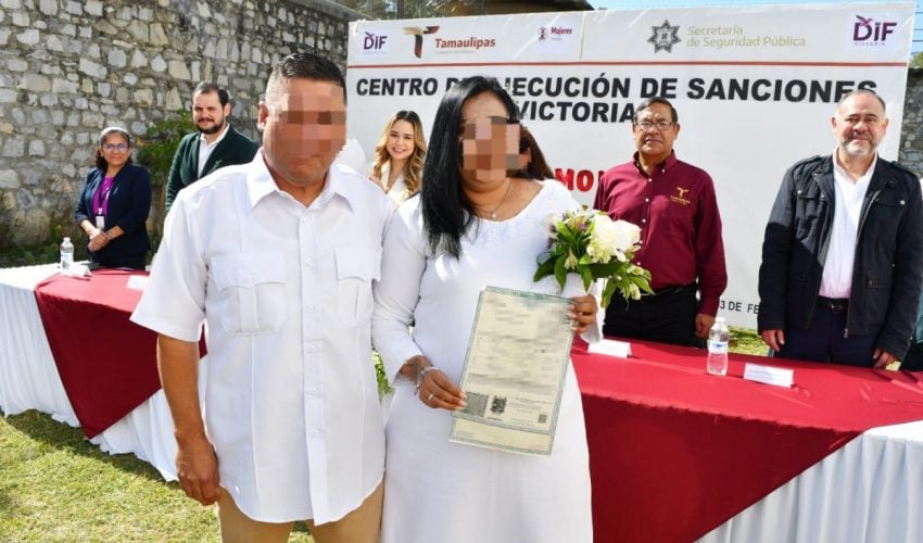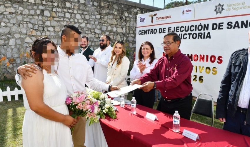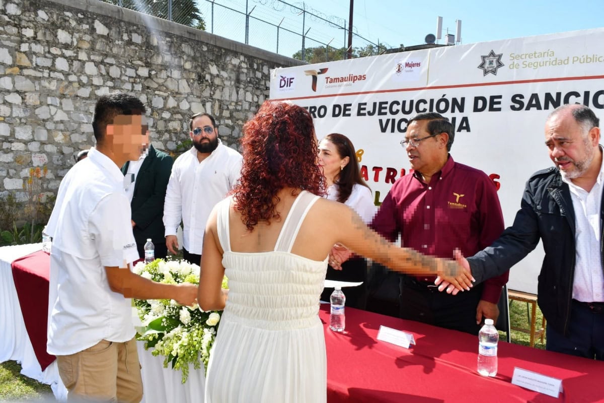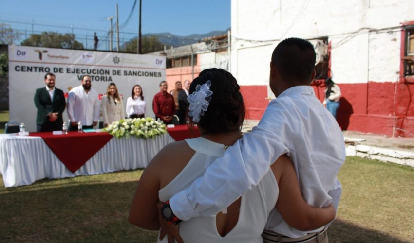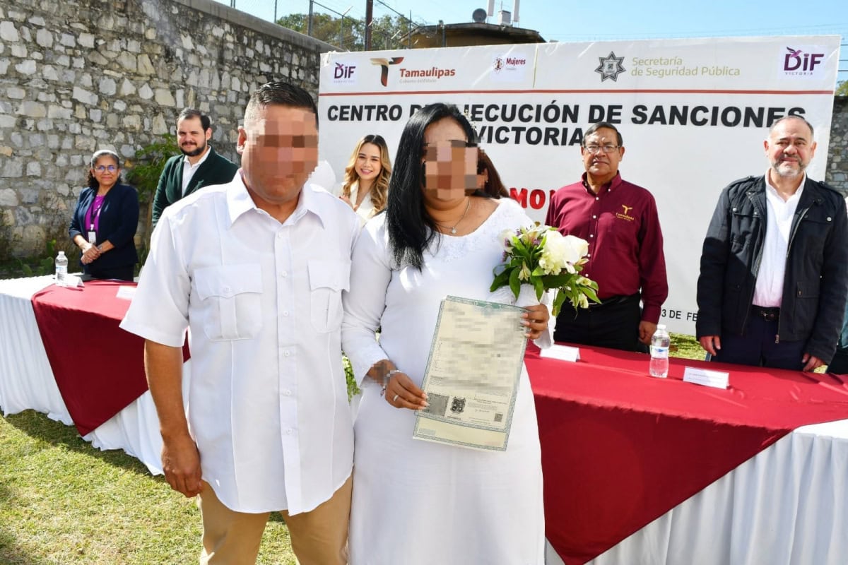 Febrero 04 de 2026 Ciudad Victoria, Tamaulipas.– Con base en el respeto a los derechos de las personas privadas de la libertad (PPLs) y en la estrategia de reinserción social, que tiene a las relaciones familiares entre sus ejes fundamentales, 21 parejas formalizaron su unión al interior del Centro de Ejecución de Sanciones (CEDES) de Ciudad Victoria. La ceremonia de matrimonios colectivos fue posible gracias a la sinergia entre la Secretaría de Seguridad Pública de Tamaulipas (SSPT), el Sistema DIF Victoria, la Dirección de Oficialías del Registro Civil y el Instituto de las Mujeres en Tamaulipas, y consistió en el enlace legal de 11 parejas integradas por PPLs y 10 entre residentes del CEDES Victoria y personas externas. “La unión en pareja que celebramos en esta fecha cobra relevancia para continuar con su programa encaminado a su reinserción a la sociedad. En lo personal, me queda desearles una vida próspera en pareja, esperando que se encuentren orgullosos del paso que están dando el día de hoy”, manifestó el director del CEDES Victoria, Mario Alberto Hernández Aguirre. Tras firmar y recibir los documentos legales, las parejas recién casadas celebraron una recepción que contó con la asistencia de sus seres queridos, quienes degustaron mole, pastel y refrescos, y participaron en las tradiciones que distinguen a las bodas mexicanas, tales como bailar el vals, “la víbora de la mar” y el lanzamiento del ramo. En representación del secretario de Seguridad Pública de Tamaulipas, Carlos Arturo Pancardo Escudero, asistió el subsecretario de Ejecución de Sanciones y Reinserción Social, Lorenzo Raúl Ruiz Vázquez, quien estuvo acompañado de la encargada del despacho de la Oficialía Número Uno del Registro Civil, María Antonia Maldonado González; la directora jurídica del Instituto de las Mujeres en Tamaulipas, Issa Graciela Edgar Álvarez, quien acudió en representación de la titular de esta dependencia, Marcia Benavides Villafranca; y personal del Sistema DIF Victoria.