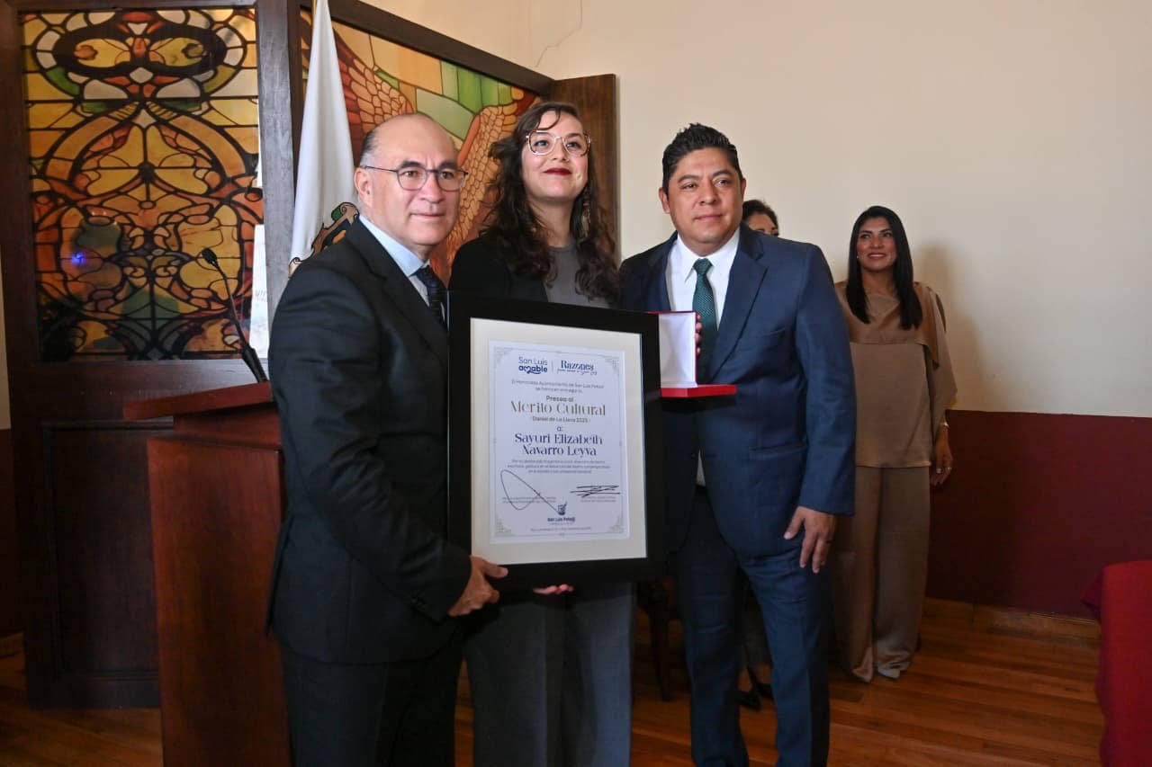 En el marco de este evento, el Mandatario potosino entregó junto al alcalde de la capital Enrique Galindo Ceballos, a la dramaturga potosina Sayuri Elizabeth Navarro Leyva, el Premio al Mérito Cultural “Daniel de la Llera 2025”, que distingue a quienes han contribuido de manera destacada a la preservación y promoción del patrimonio cultural potosino.