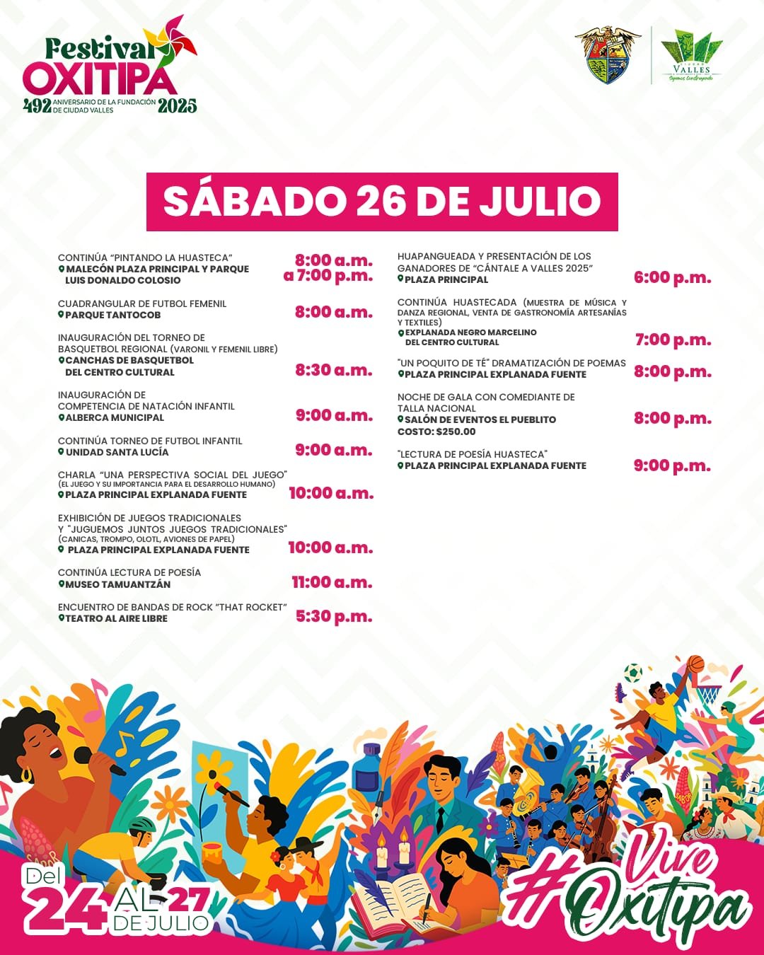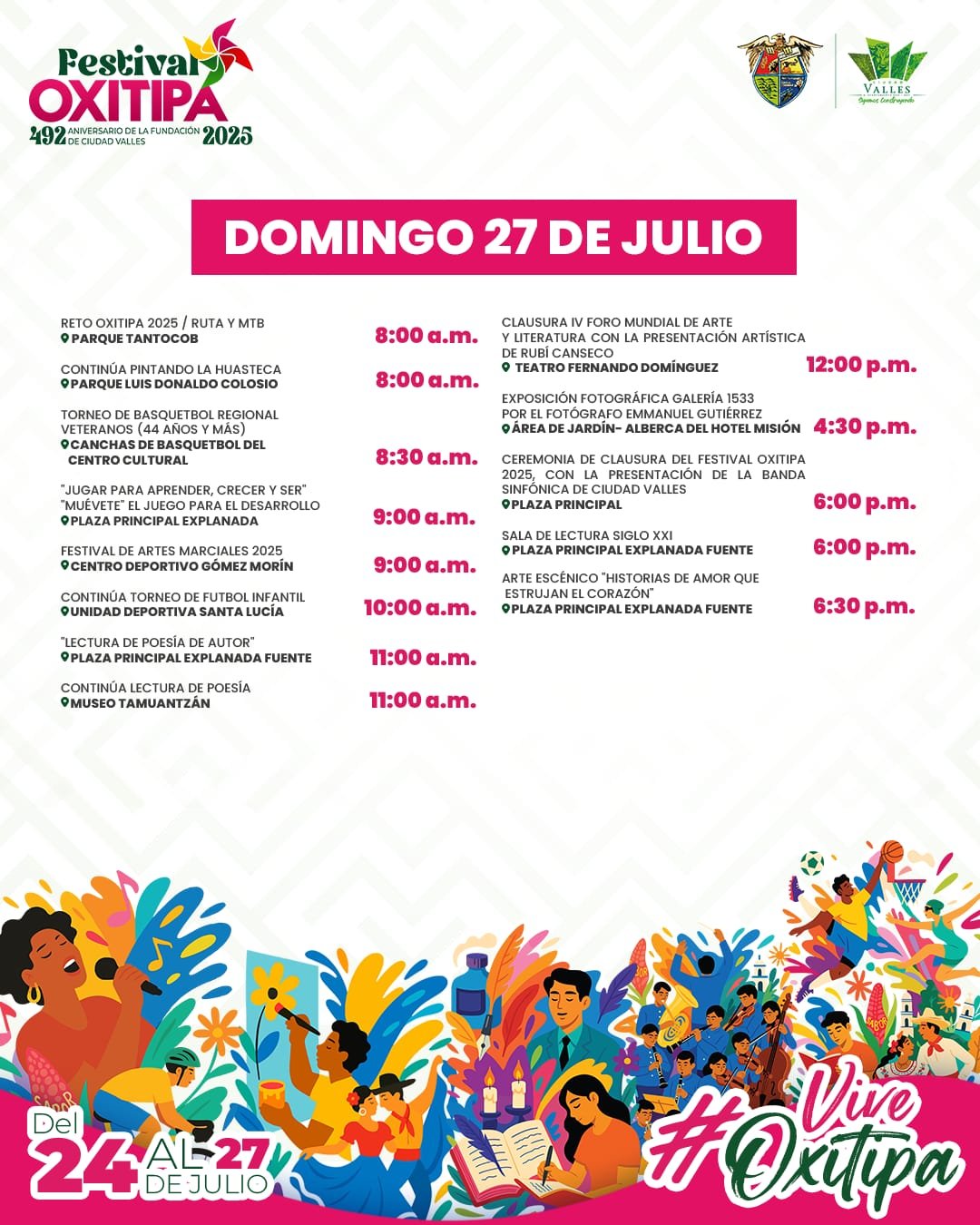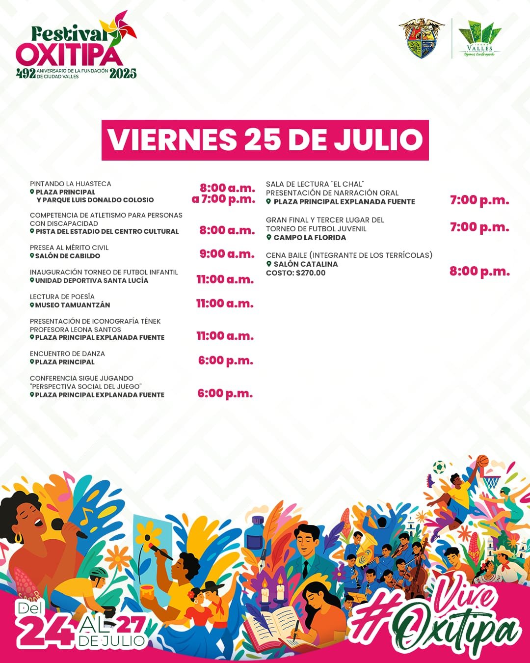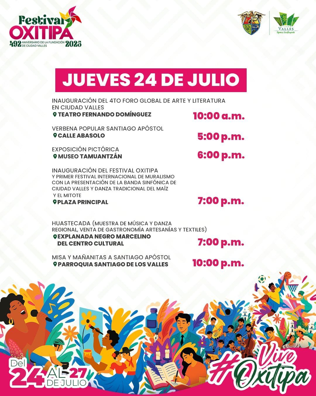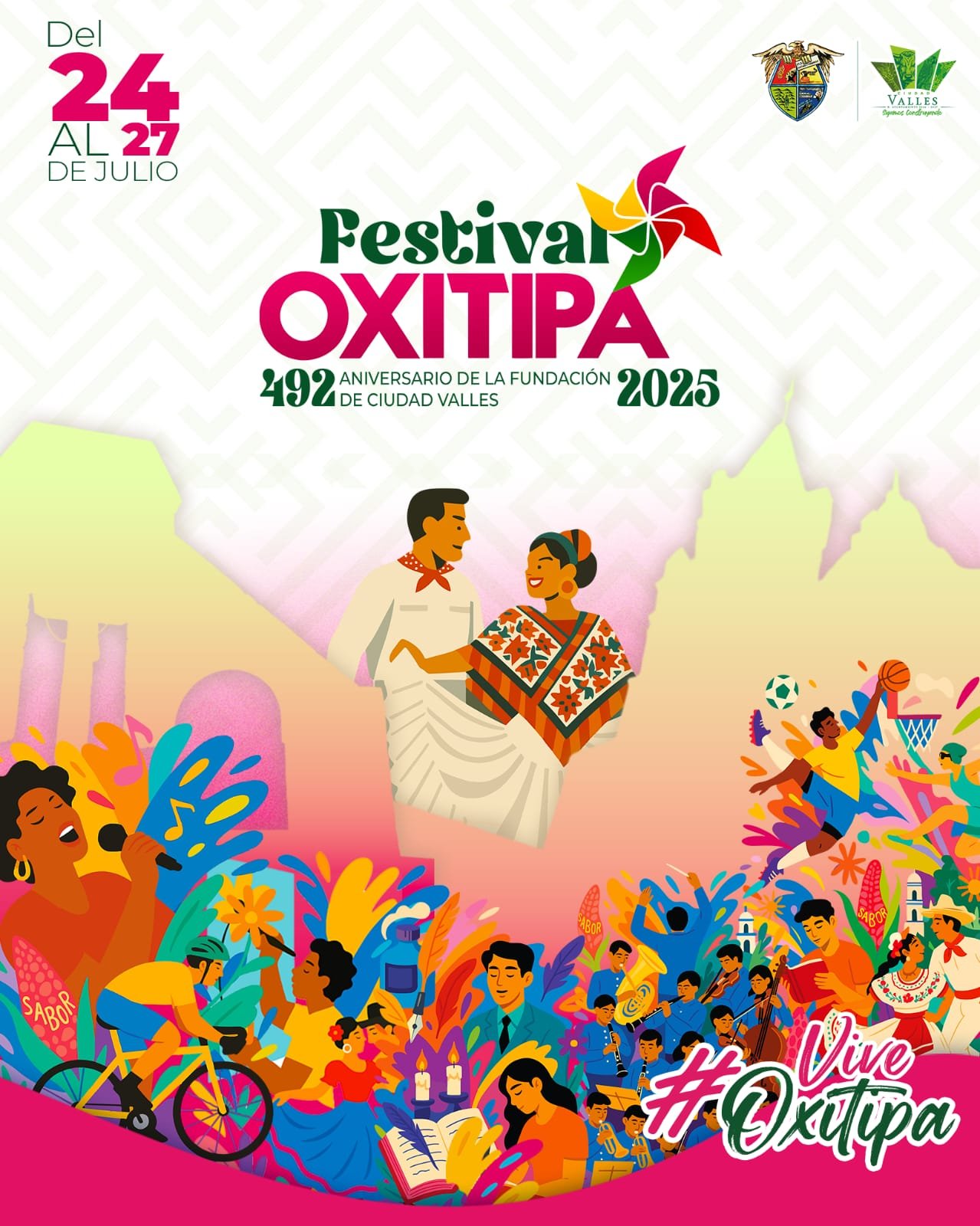 🎉 ¡Ciudad Valles está de fiesta! Del 24 al 27 de julio, celebremos juntos el 492 Aniversario de la fundación de nuestra ciudad con el Festival Vive Oxitipa 2025, un homenaje a nuestra historia, nuestras raíces y la fuerza de nuestra gente. ✨