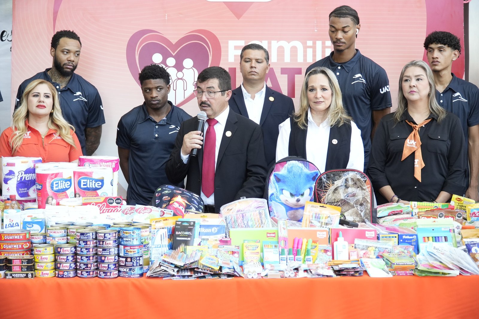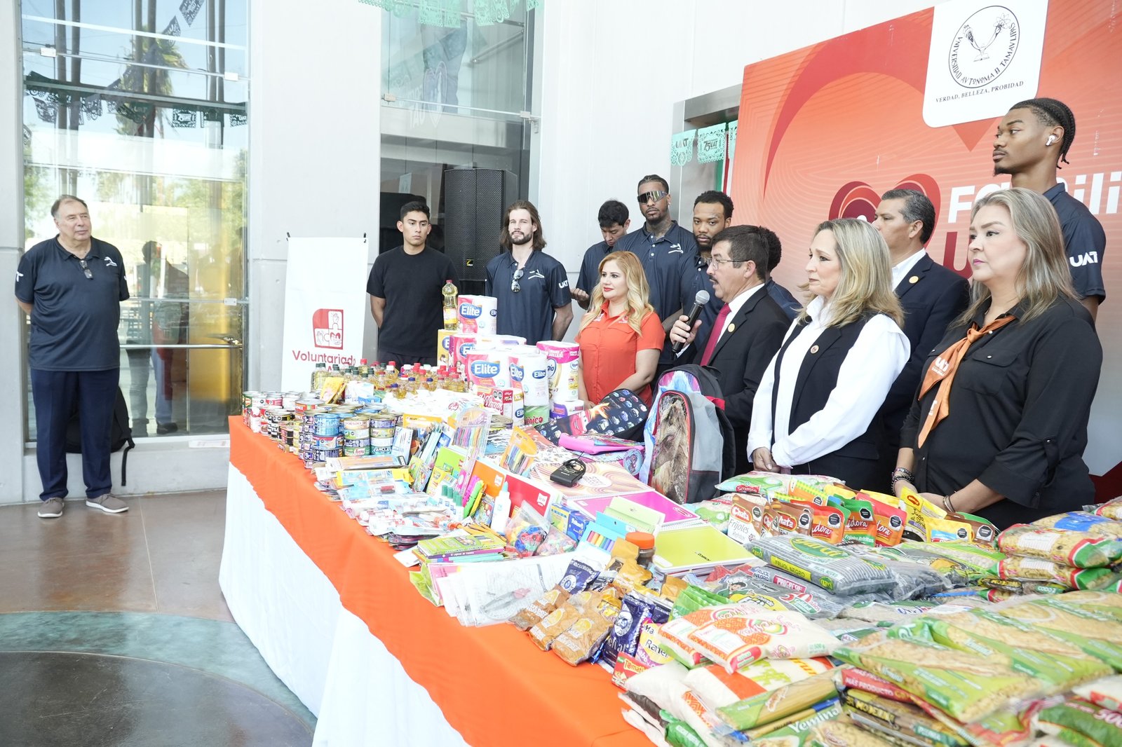 El rector de la Universidad Autónoma de Tamaulipas, Dámaso Anaya Alvarado, acompañado de su esposa, la Lic. Isolda Rendón de Anaya, presidenta de Familia UAT, recibió, del Club Correcaminos de basquetbol profesional (Correbasket), un donativo de víveres y útiles escolares recaudados por el equipo durante sus encuentros en el Gimnasio Multidisciplinario de Victoria, dentro de la Temporada 2025 de la Liga Caliente MX LNBP.