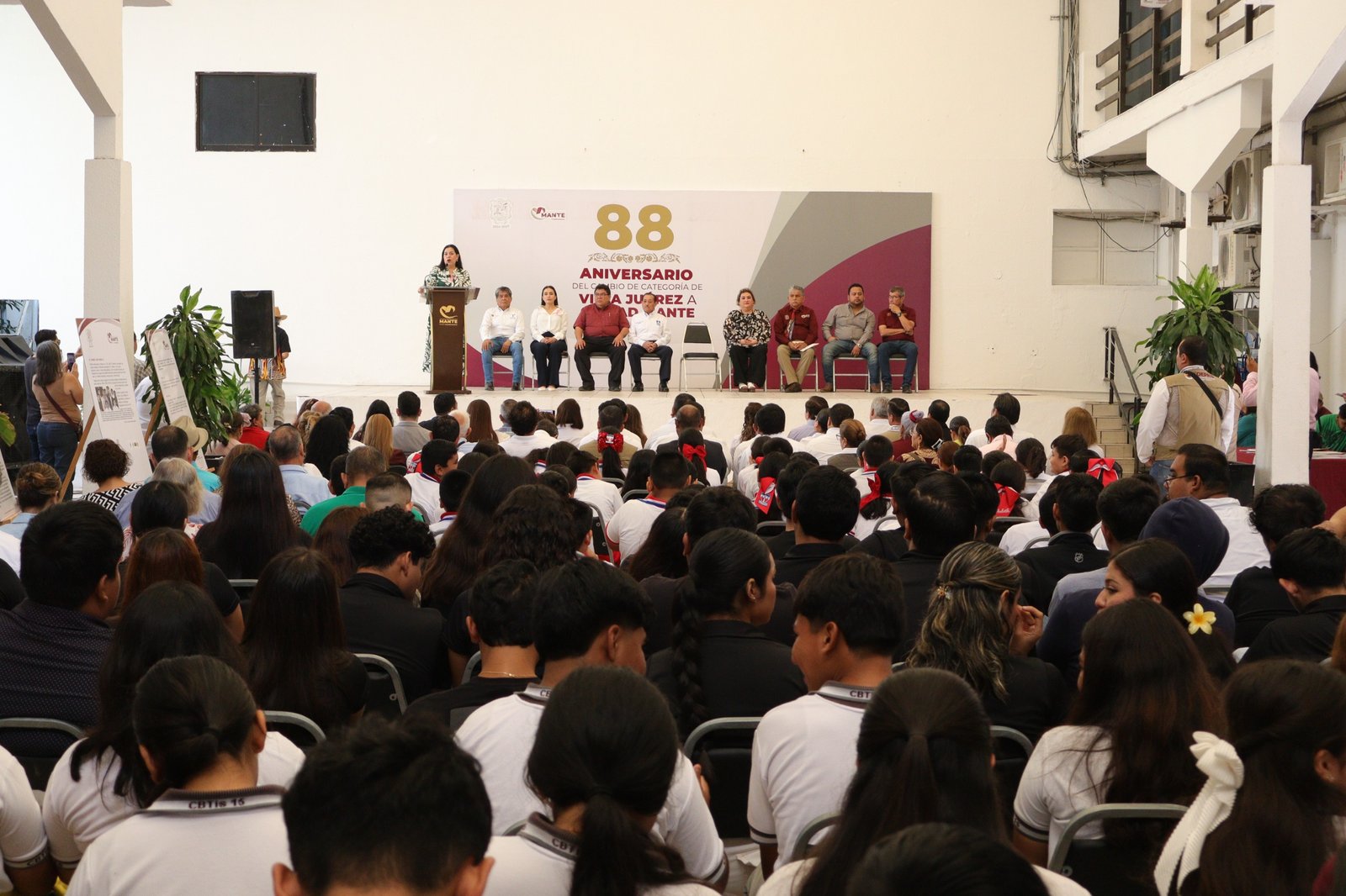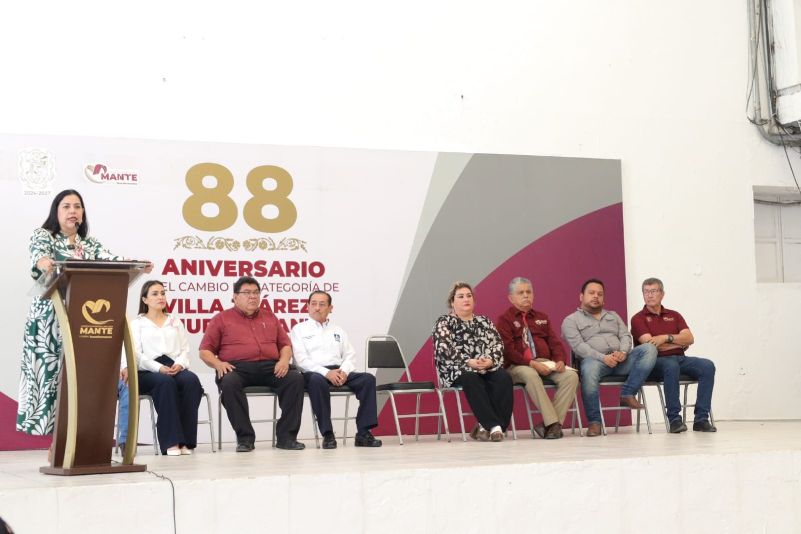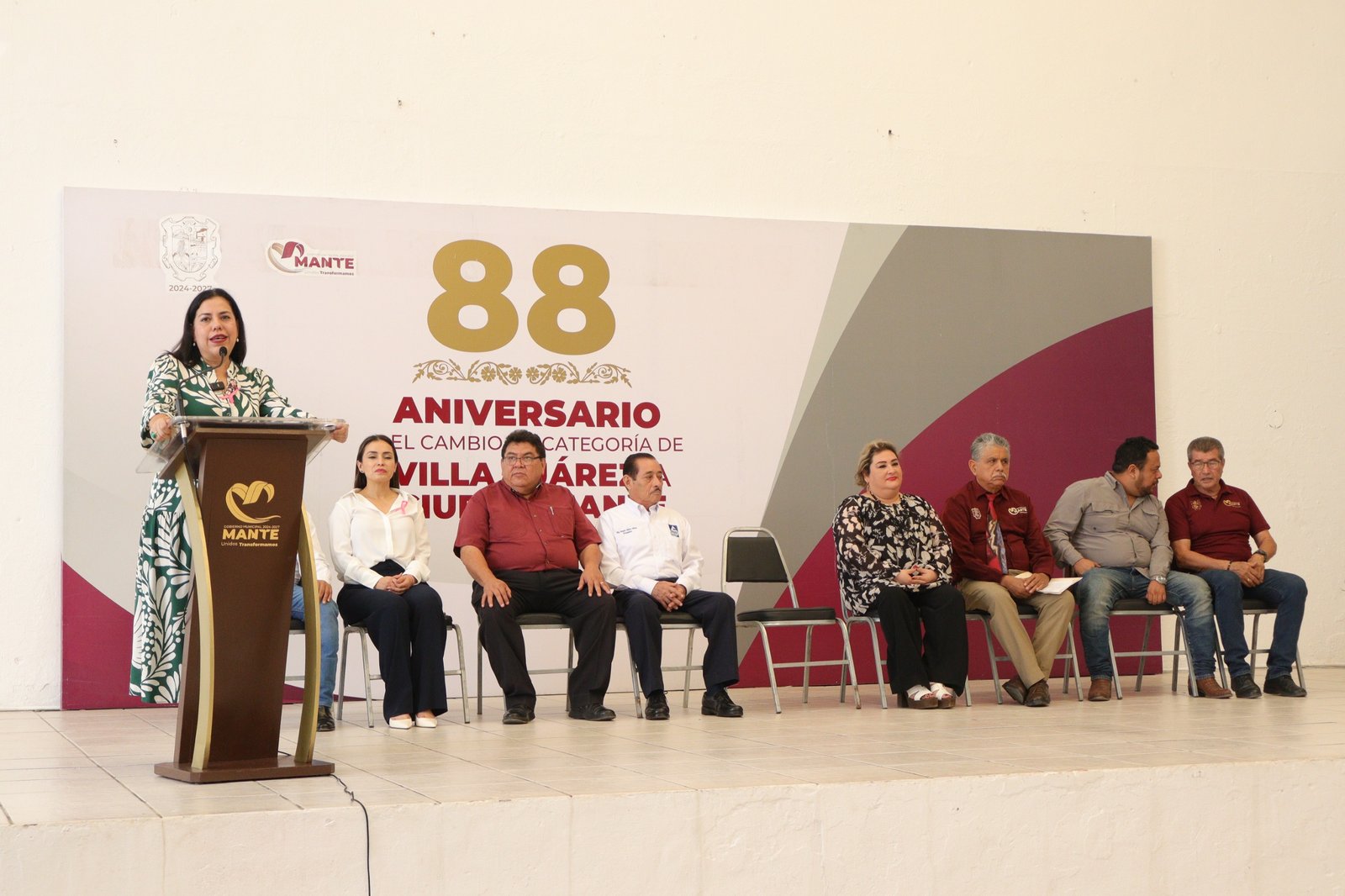 En el marco de la ceremonia por el 88 Aniversario de la elevación de rango político de Villa Juárez a Ciudad Mante, celebrada esta mañana en la explanada de la Presidencia Municipal, la alcaldesa Patty Chío convocó a los funcionarios de los tres niveles de gobierno, así como a líderes de sectores y organizaciones, a trabajar en unidad por la transformación de El Mante.