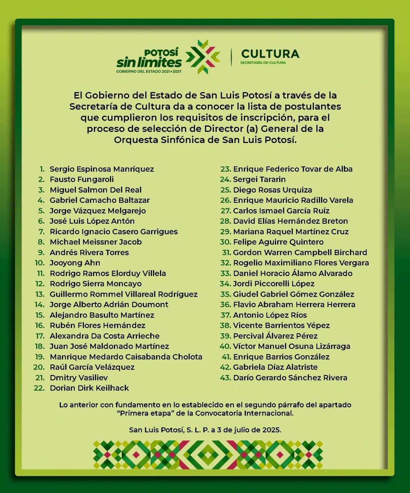 En seguimiento a la Convocatoria Internacional para el proceso de selección de la persona que ocupará la Dirección General de la Orquesta Sinfónica de San Luis Potosí, el Gobierno del Estado encabezado por Ricardo Gallardo Cardona, a través de la Secretaría de Cultura (Secult), informa que este 03 de julio de 2025 se publicó en sus redes oficiales la lista de aspirantes que cumplieron con los requisitos establecidos en la convocatoria conforme al párrafo segundo del apartado denominado Primera Etapa.