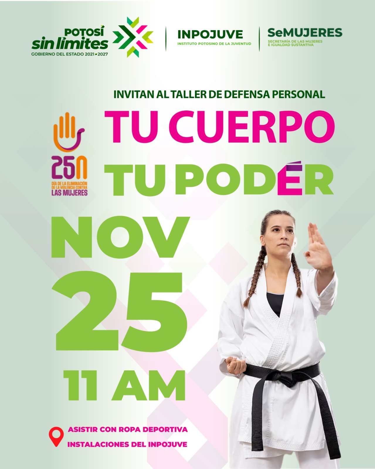 Como parte de las actividades por el 25 de noviembre Día Internacional de la Eliminación de la Violencia contra la Mujer, el Instituto Potosino de la Juventud (Inpojuve) y la Secretaría de las Mujeres e Igualdad Sustantiva (Semujeres), invitan a participar en el taller de defensa personal “Tu cuerpo, tu poder”, impartido por la sensei segundo Dan en Karate Do, Grecia Villa, el próximo 25 de noviembre a las 11:00 horas en las instalaciones del Inpojuve.