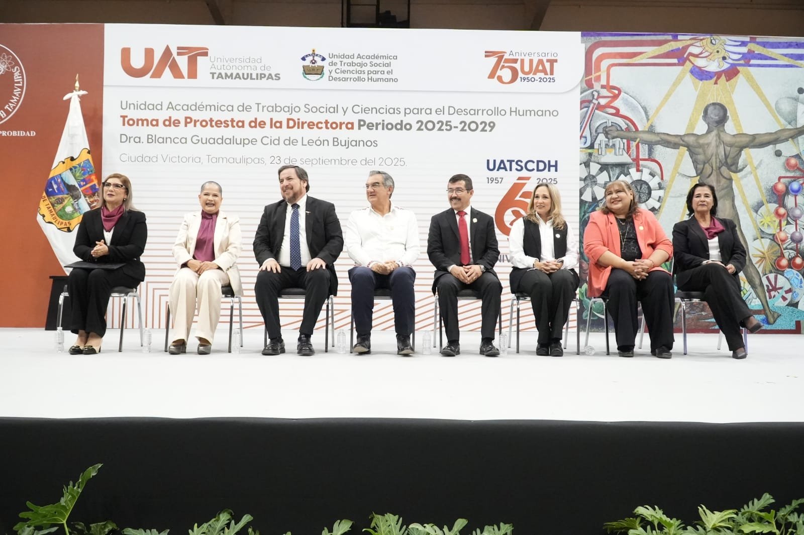 Teniendo como testigo de honor al gobernador Américo Villarreal Anaya, el rector de la Universidad Autónoma de Tamaulipas (UAT), Dámaso Anaya Alvarado, le tomó protesta a la nueva directora de la Unidad Académica de Trabajo Social y Ciencias para el Desarrollo Humano (UATSCDH), Dra. Blanca Guadalupe Cid de León Bujanos, quien asume el cargo para el periodo 2025-2029.