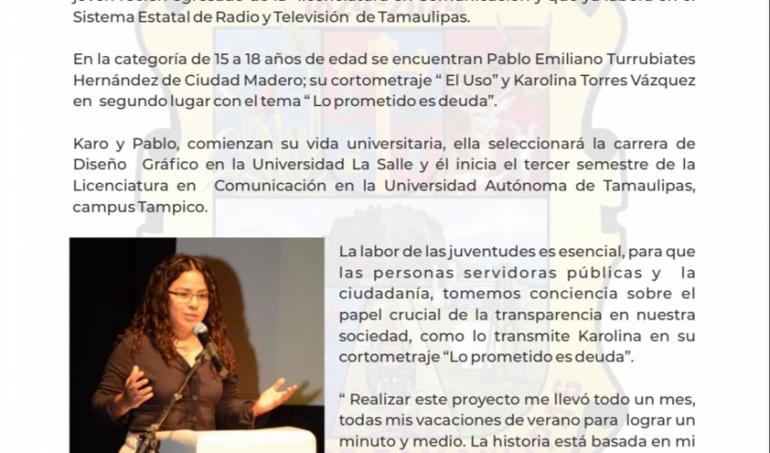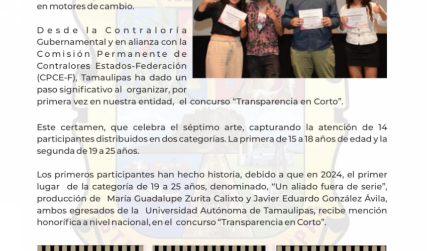 Octubre 29 de 2025  Ciudad Victoria, Tamaulipas.- La Secretaría Anticorrupción y Buen Gobierno del Estado de Tamaulipas (SABG), dirigida por Norma Angélica Pedraza Melo, fue reconocida en la edición número XI de la revista Contralores MX 2025 por su primera experiencia institucional en el certamen “Transparencia en Corto”, una iniciativa que busca fomentar valores cívicos a través del arte audiovisual.   Este concurso, organizado en colaboración con la Comisión Permanente de Contralores Estados-Federación (CPCE-F), se ha convertido en una plataforma para que las juventudes expresen su visión sobre la transparencia y la rendición de cuentas.   En su primera edición, “Transparencia en Corto 2024”, logró convocar en Tamaulipas a 14 jóvenes divididos en dos categorías: de 15 a 18 años y de 19 a 25.   María Guadalupe Zurita Calixto y Javier Eduardo González Ávila, representaron al estado a nivel nacional con “Un aliado fuera de serie” y obtuvieron mención honorífica.   La segunda edición “Transparencia en Corto 2025”, con 18 proyectos inscritos en las mismas categorías, superó la participación anterior. En esta ocasión, Horus Jacob Ruiz Hernández se llevó el primer lugar con su cortometraje “Con las plantas no, transparencia como herramienta contra la desinformación”, mientras que María Guadalupe Zurita Calixto repitió como ganadora con su video “El virus de la desinformación”.  “Con este tipo de iniciativas, la Secretaría Anticorrupción y la Comisión Permanente de Contralores Estados – Federación reafirman su apuesta por el talento joven como motor de transformación, impulsando la creatividad y promoviendo una cultura de transparencia desde edades tempranas”, expresó Pedraza Melo. Hoy 29 de octubre de 2025 la Comisión Permanente de Contralores Estados Federación da a conocer a los ganadores a nivel nacional y los resultados se compartirán en las redes sociales de la Secretaría Anticorrupción y Buen Gobierno de Tamaulipas. La premiación nacional será en el marco de la LXXV Reunión Nacional de la Comisión Permanente en noviembre de 2025.