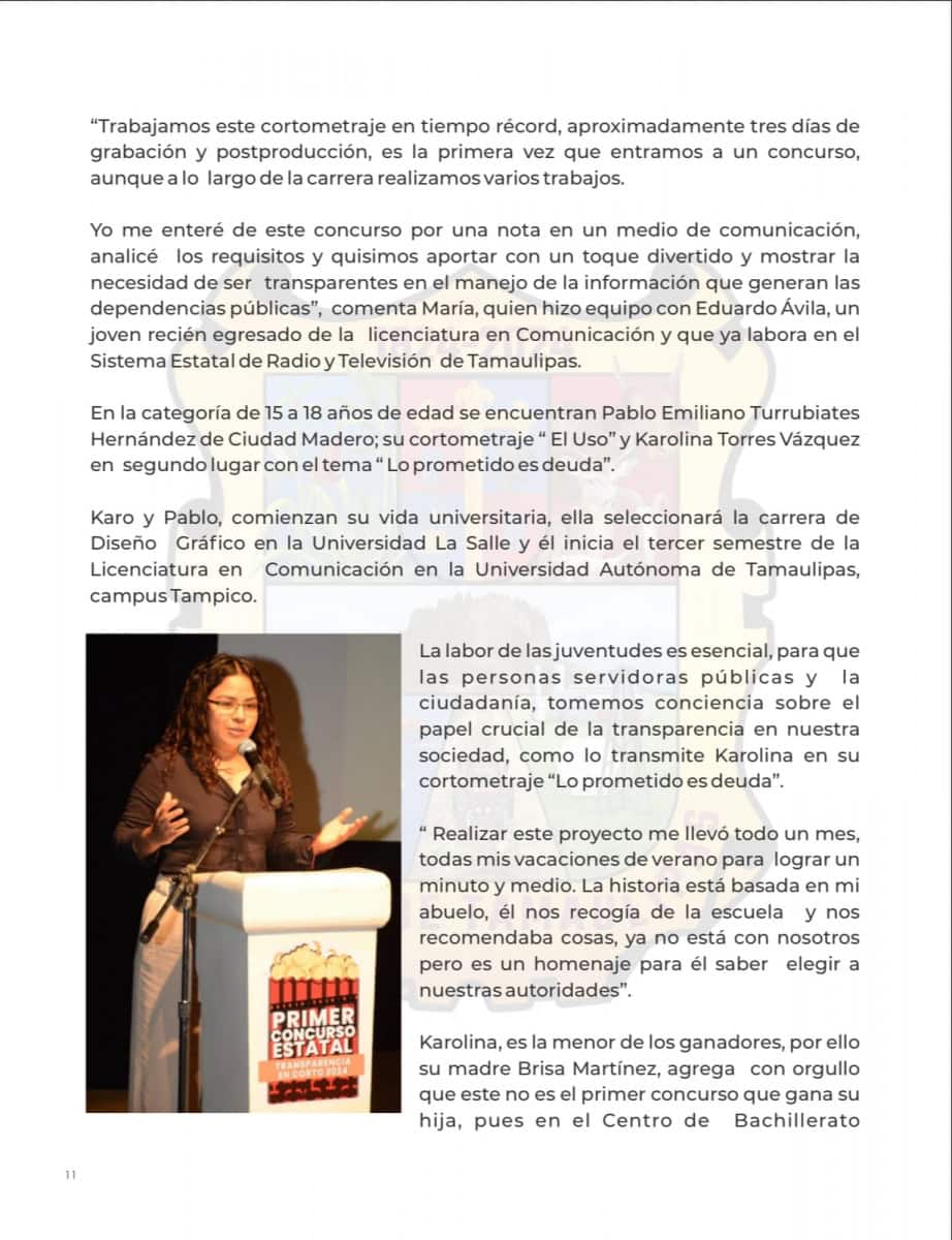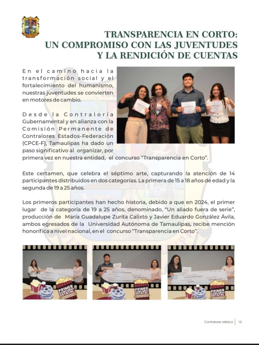 Octubre 29 de 2025  Ciudad Victoria, Tamaulipas.- La Secretaría Anticorrupción y Buen Gobierno del Estado de Tamaulipas (SABG), dirigida por Norma Angélica Pedraza Melo, fue reconocida en la edición número XI de la revista Contralores MX 2025 por su primera experiencia institucional en el certamen “Transparencia en Corto”, una iniciativa que busca fomentar valores cívicos a través del arte audiovisual.   Este concurso, organizado en colaboración con la Comisión Permanente de Contralores Estados-Federación (CPCE-F), se ha convertido en una plataforma para que las juventudes expresen su visión sobre la transparencia y la rendición de cuentas.   En su primera edición, “Transparencia en Corto 2024”, logró convocar en Tamaulipas a 14 jóvenes divididos en dos categorías: de 15 a 18 años y de 19 a 25.   María Guadalupe Zurita Calixto y Javier Eduardo González Ávila, representaron al estado a nivel nacional con “Un aliado fuera de serie” y obtuvieron mención honorífica.   La segunda edición “Transparencia en Corto 2025”, con 18 proyectos inscritos en las mismas categorías, superó la participación anterior. En esta ocasión, Horus Jacob Ruiz Hernández se llevó el primer lugar con su cortometraje “Con las plantas no, transparencia como herramienta contra la desinformación”, mientras que María Guadalupe Zurita Calixto repitió como ganadora con su video “El virus de la desinformación”.  “Con este tipo de iniciativas, la Secretaría Anticorrupción y la Comisión Permanente de Contralores Estados – Federación reafirman su apuesta por el talento joven como motor de transformación, impulsando la creatividad y promoviendo una cultura de transparencia desde edades tempranas”, expresó Pedraza Melo. Hoy 29 de octubre de 2025 la Comisión Permanente de Contralores Estados Federación da a conocer a los ganadores a nivel nacional y los resultados se compartirán en las redes sociales de la Secretaría Anticorrupción y Buen Gobierno de Tamaulipas. La premiación nacional será en el marco de la LXXV Reunión Nacional de la Comisión Permanente en noviembre de 2025.