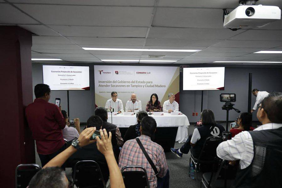 Febrero 18 de 2026 Tampico, Tamaulipas. – Con el objetivo de atender de manera prioritaria uno de los principales retos que enfrenta la zona sur del estado, el gobernador Américo Villarreal Anaya instruyó destinar una inversión inicial de 105 millones de pesos para atender la problemática de socavones en Tampico y Ciudad Madero. En rueda de prensa, el secretario de Recursos Hidráulicos, Raúl Quiroga Álvarez, acompañado por la alcaldesa de Tampico, Mónica Villarreal; el presidente municipal de Ciudad Madero, Erasmo González Robledo; y el gerente de Comapa Sur, Francisco González Casanova, explicó que la infraestructura hidrosanitaria de la zona presenta una antigüedad aproximada de 60 años, derivada de un rezago histórico en materia de conservación y rehabilitación. “Estamos construidos en suelos arenosos con alta permeabilidad, lo que permite la infiltración de humedad y eleva el manto freático”, señaló el titular de la dependencia, al detallar los factores técnicos que inciden en la formación de socavones. Durante la presentación se expusieron proyecciones estadísticas con tres escenarios: uno conservador, considerando la repetición de cifras registradas en 2024; un escenario medio, similar al comportamiento observado en 2025, que representó un reto importante para los ayuntamientos y el organismo operador; y un escenario crítico, en el que la tendencia de los últimos tres años continúe en aumento. Ante este panorama, el Gobierno del Estado determinó ejecutar 37 acciones en Tampico y 17 en Ciudad Madero, priorizando aquellas zonas con mayor riesgo para la población, con el fin de prevenir afectaciones a la integridad de las personas y a la salud pública. Finalmente, se informó que los recursos comenzarán a ejercerse de manera inmediata, con el objetivo de que los trabajos correspondientes a esta primera etapa queden concluidos en un periodo estimado de cuatro meses. Posteriormente, se dará paso a la programación de una segunda etapa, a fin de dar continuidad a las acciones y ampliar el alcance de atención para la solución integral de esta problemática en la zona sur del estado.