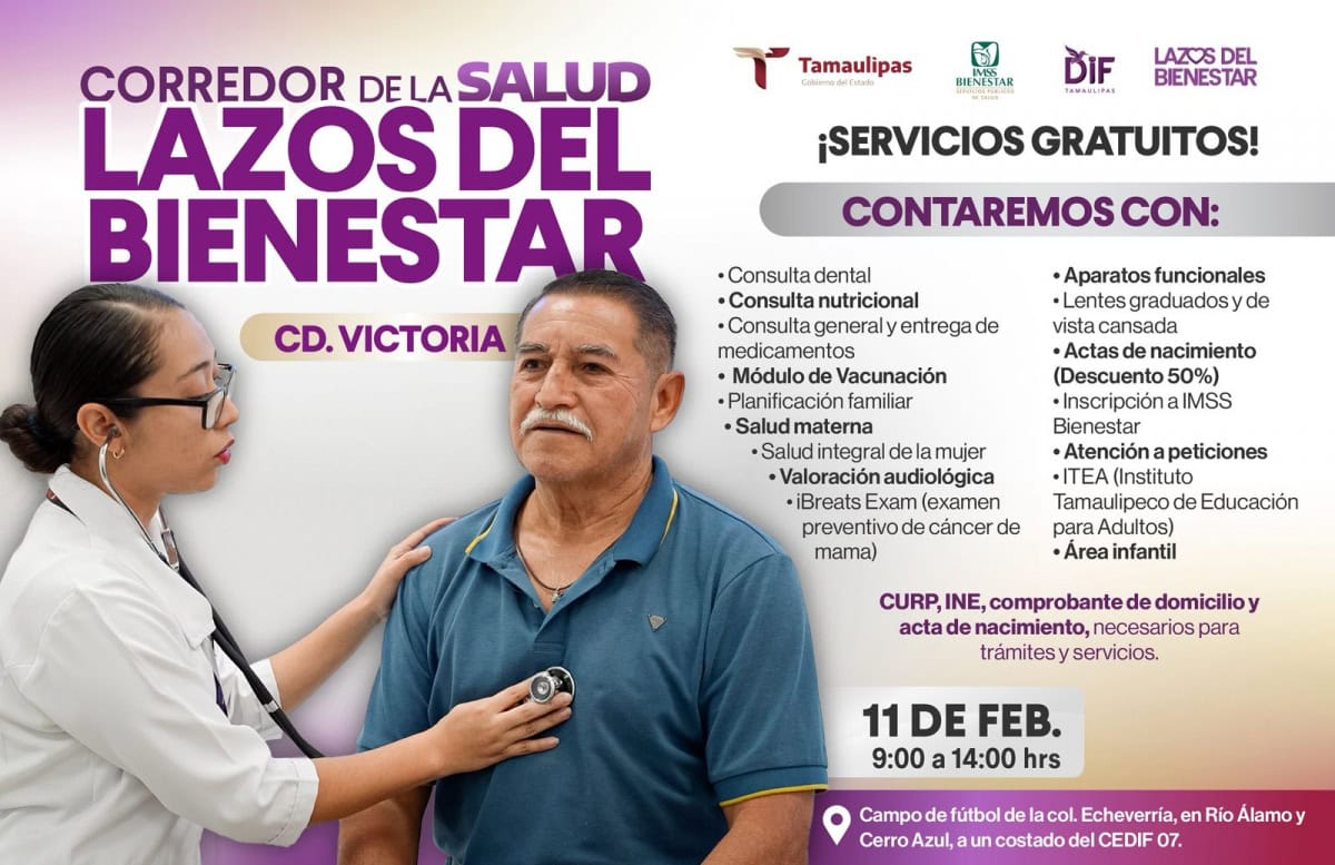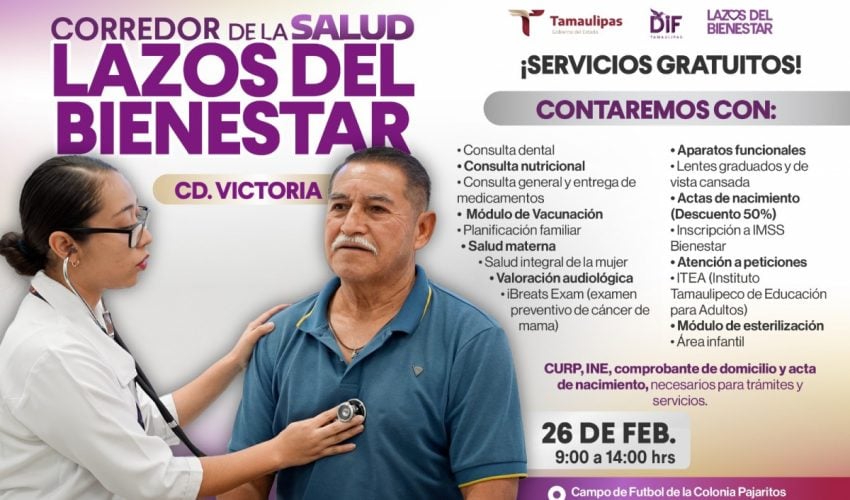 Febrero 10 de 2026 Ciudad Victoria, Tamaulipas.- El Sistema DIF Tamaulipas, que preside la doctora María de Villarreal, en coordinación con el Gobierno del Estado y el IMSS Bienestar, invita a las familias a participar en los Corredores de la Salud “Lazos del Bienestar”, una estrategia que acerca servicios gratuitos de salud, prevención, orientación y trámites. A través de estas jornadas, en las que también participa personal de las Secretarías de Salud, Educación y General de Gobierno, se busca que las familias puedan acceder de manera directa a consultas médicas, módulos preventivos y apoyos funcionales, además de realizar gestiones que impactan en su bienestar y su entorno. El primer Corredor de la Salud se lleva a cabo este miércoles 11 de febrero en Ciudad Victoria, en un horario de 9:00 a 14:00 horas, en el campo de fútbol de la colonia Echeverría, ubicado en las calles Río Álamo y Cerro Azul, a un costado del CEDIF 07. El segundo se realizará también en la capital del estado el jueves 26 de febrero, de 9:00 a 14:00 horas, en el campo de fútbol de la colonia Pajaritos, ubicado en avenida Los Patos con avenida Chile S/N, en Ciudad Victoria. Durante estas jornadas se contará con servicios gratuitos como consulta dental, nutricional y general, así como entrega de medicamentos, módulo de vacunación, planificación familiar, salud materna, salud integral de la mujer, valoración audiológica y examen preventivo de cáncer de mama (iBreast Exam). Asimismo, se brindará atención con aparatos funcionales, lentes graduados y para vista cansada, además de servicios y trámites como actas de nacimiento con descuento del 50%, inscripción al IMSS Bienestar, atención a peticiones, orientación del ITEA (Instituto Tamaulipeco de Educación para Adultos), módulo de esterilización de mascotas, área infantil, entre otros apoyos enfocados en el bienestar integral. Para realizar trámites y acceder a algunos servicios, se recomienda acudir con CURP, INE, comprobante de domicilio y acta de nacimiento. Para el DIF Tamaulipas, estas acciones se fortalecen cuando la sociedad participa de forma activa, colaborativa y solidaria, pues es desde la comunidad donde se construyen soluciones reales, cercanas y sostenibles para incidir positivamente en cada colonia y en cada familia.