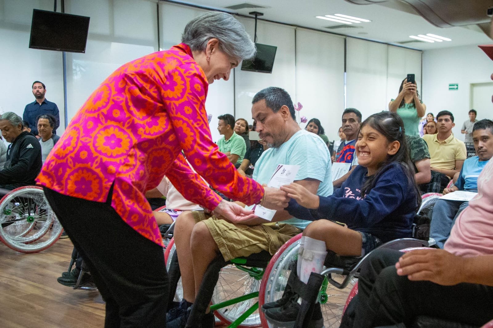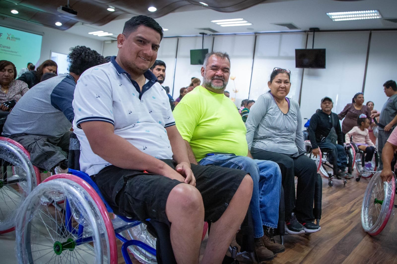 En esta ocasión se llevó a cabo la entrega de 29 sillas de ruedas activas y una silla bipedestadora, un modelo especial que permite al usuario ponerse de pie y regresar a la posición original de la silla de manera casi inmediata. Esto ayuda a evitar la aparición de llagas y permite un movimiento en el cuerpo que mejora la circulación sanguínea.