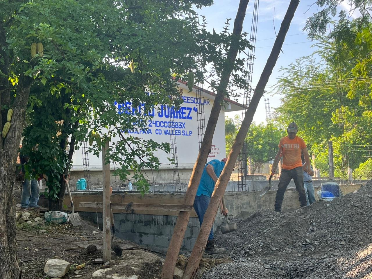 En un trabajo coordinado entre la Dirección de Educación Municipal, a cargo de Romeo Aguilar Colunga, y la Dirección de Obras Públicas, encabezada por Kevin Yair Cázares Olvera, del H. Ayuntamiento de Ciudad Valles, se llevan a cabo trabajos de acondicionamiento de un aula que será utilizada de manera provisional por un periodo de dos a tres meses, mientras se concluye la construcción del aula definitiva en el Centro Educativo Preescolar “Benito Juárez” del Ejido Tanculpaya.