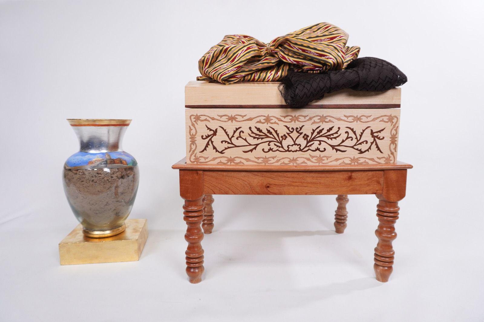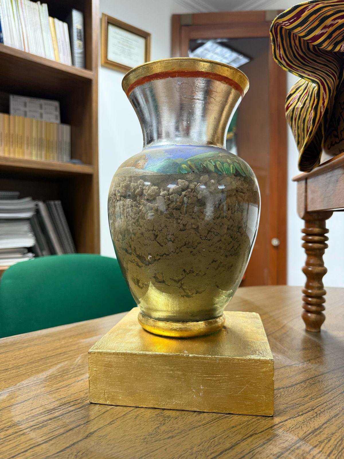 Asimismo, un jarrón con detalles en chapa de oro, pintado a mano con paisajes de Cerro de San Pedro con base, boca y polvo enchapados en oro, además de tierra de Cerro de San Pedro, emblemática por su historia minera, que representa el origen y riqueza del Real de Minas que dio pie a la fundación de San Luis Potosí capital.