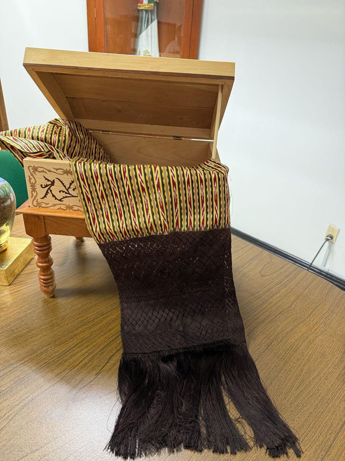 Por instrucción del Gobernador del Estado, Ricardo Gallardo Cardona, la dependencia entregó: un baúl con base marqueteado de taracería, una pieza elaborada en cedro con base torneada de pino, resultado del trabajo manual de artesanos locales; un rebozo de seda tradicional, conocido como caramelo de siete colores tejido con seis mil 500 hilos que combinan seda pura y algodón que incluye un anillo dorado.