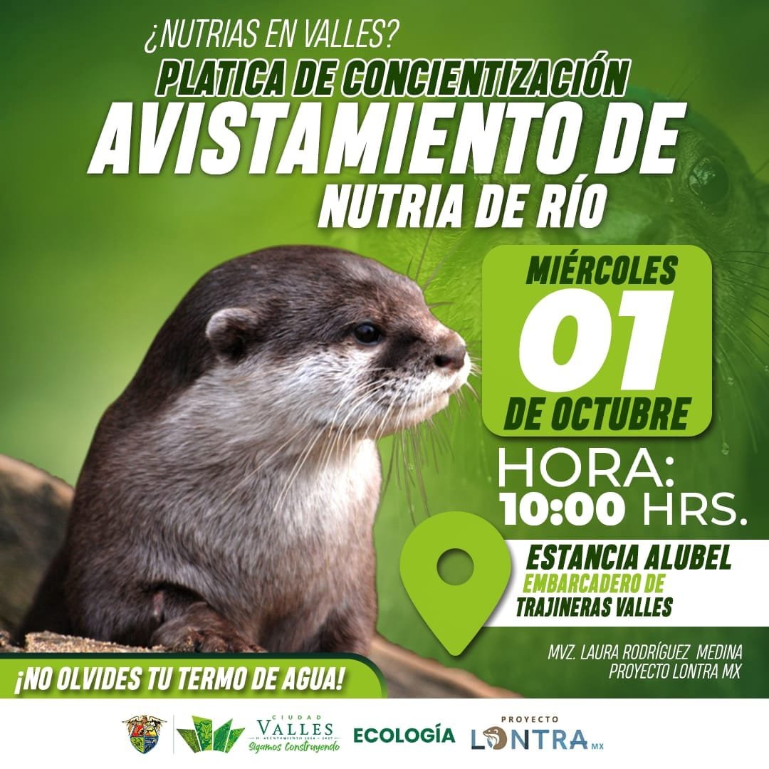 El H. Ayuntamiento de Ciudad Valles, a través de la Dirección de Ecología, que dirige Julio César Otero Torres, invita a jóvenes, pescadores, estudiantes, prestadores de servicios turísticos y ciudadanía en general a la plática que se estará impartiendo sobre la importancia de la conservación y preservación de las nutrias de río, misma que se da tras el avistamiento de un mamífero en el Río Valles.