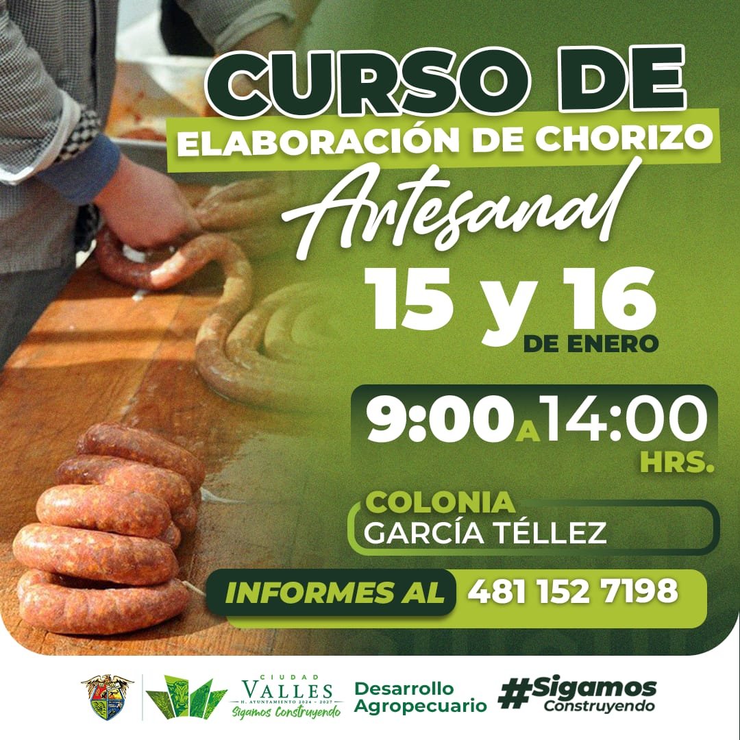 ✅️ El H. Ayuntamiento de Ciudad Valles, a través de la Dirección de Desarrollo Agropecuario, invita a las y los habitantes de la colonia Ignacio García Téllez a participar en el primer curso-taller del 2026 para la elaboración de chorizo artesanal, una actividad pensada para fortalecer el autoempleo y las habilidades productivas de la comunidad.