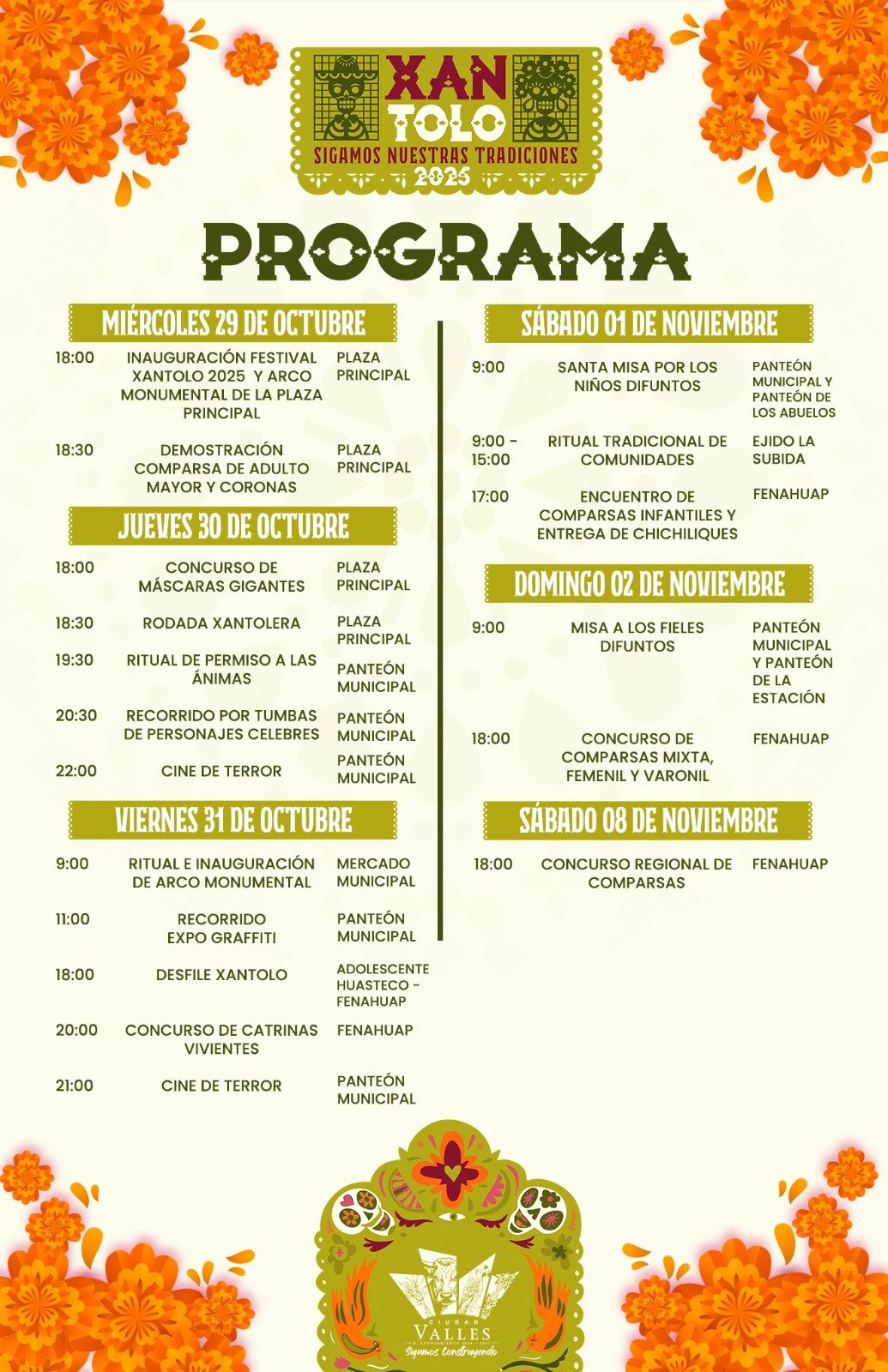 CIUDAD VALLES.- En el marco de las festividades por el “Día de Muertos”, el Gobierno Municipal, que encabeza el Presidente Municipal David Armando Medina Salazar, hace una cordial invitación para todas las familias y ciudadanía en general a participar y formar parte de las actividades que se estarán desarrollando a lo largo de seis días en el Festival Xantolo 2025.
