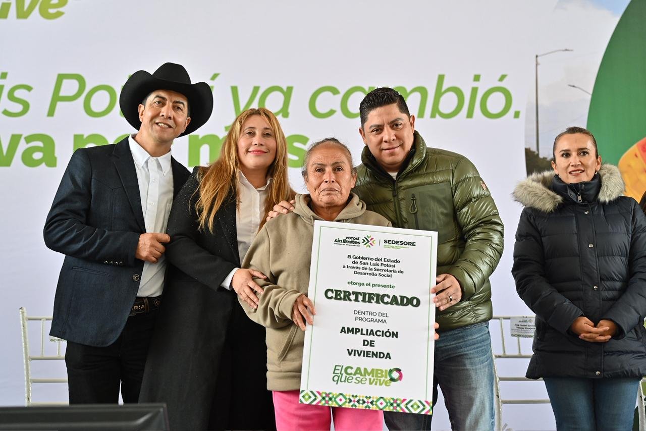 Durante el banderazo de arranque, Ricardo Gallardo entregó un paquete de mejora de vivienda para 62 familias de los ejidos y localidades: Martínez, El Sabino, La Cañada, San José del Corito, Nueva Reforma, Olla del Durazno y Rancho del Pro, y expuso que este programa reducirá de manera significativa el rezago habitacional, al mejorar la calidad de vida de las familias mediante la construcción de cuartos adicionales y espacios que fortalecen la calidad de vida en cada hogar.