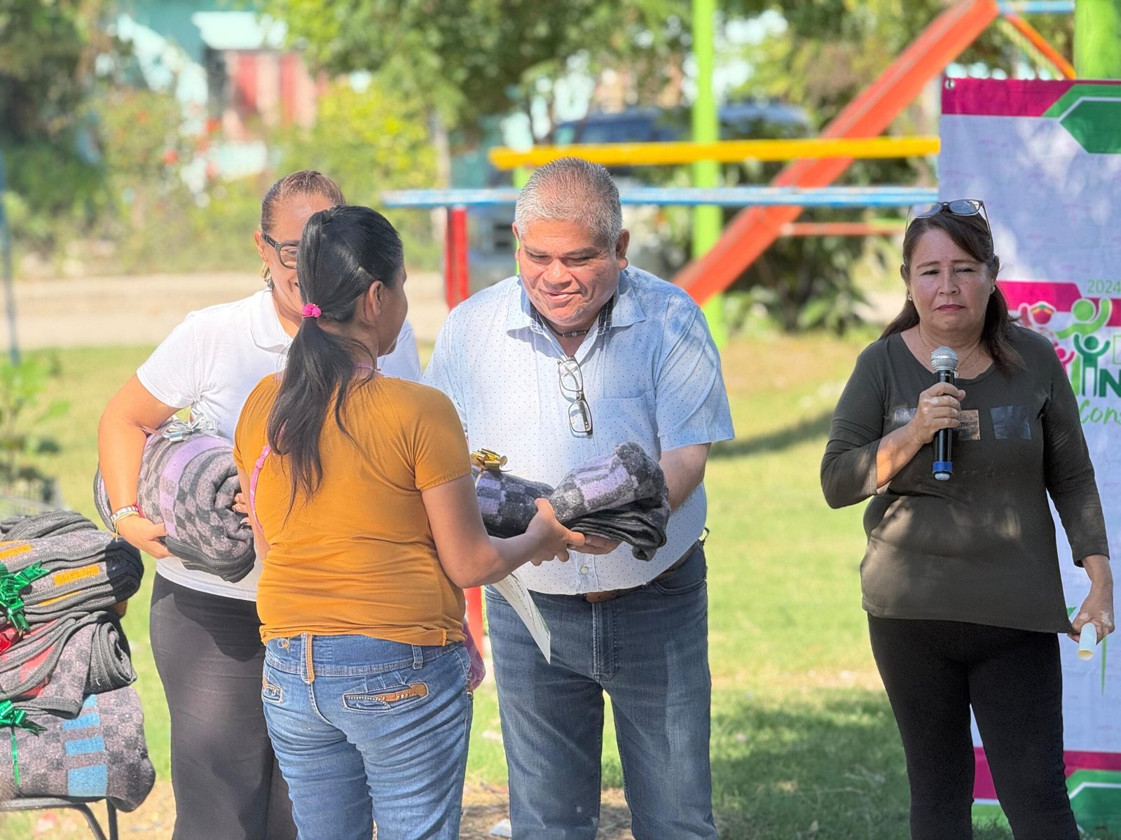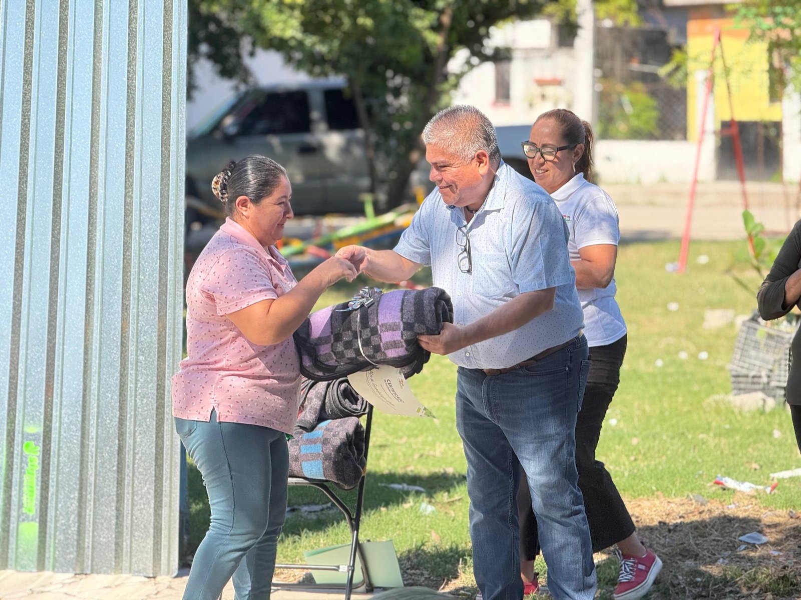 Durante esta entrega, tanto el Secretario del Ayuntamiento como la titular del INMUVI realizaron la entrega de constancias a las y los beneficiarios, certificando la entrega de este programa, además de entregar cobijas a nombre del Presidente Municipal David Armando Medina Salazar mismas que beneficiaron a muchas familias.