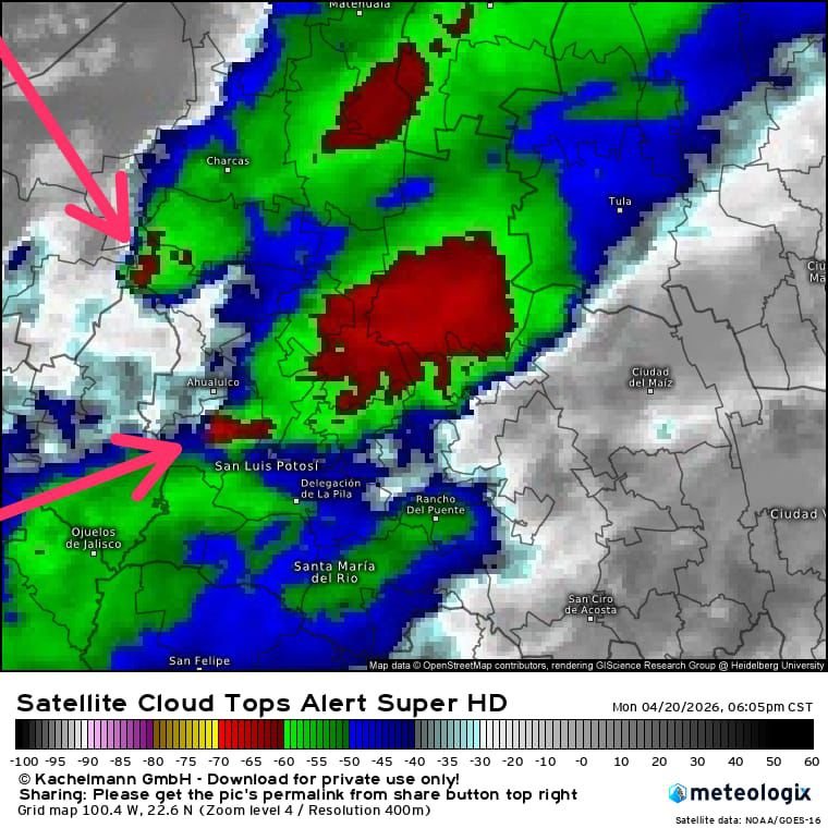 Las precipitaciones han sido puntuales fuertes en municipios como Vanegas, Cedral, Matehuala, Villa de la Paz y Real de Catorce, y se prevé que continúe el potencial de tormentas intensas acompañadas de viento y posible caída de granizo en las próximas horas, además de alta probabilidad de lluvias en la región Centro y área metropolitana, especialmente en Soledad de Graciano Sánchez y la capital.