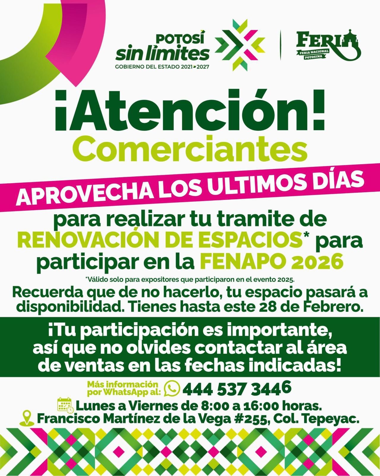 Como parte del cambio que se vive y se siente, esta plataforma comercial estratégica impulsa la economía local y genera oportunidades reales para cientos de familias potosinas, por lo que se invita a las y los interesados a acudir a las oficinas del Patronato, ubicadas en Francisco Martínez de la Vega #255, o solicitar información vía WhatsApp al 444 537 3446 para asegurar su participación en 2026.