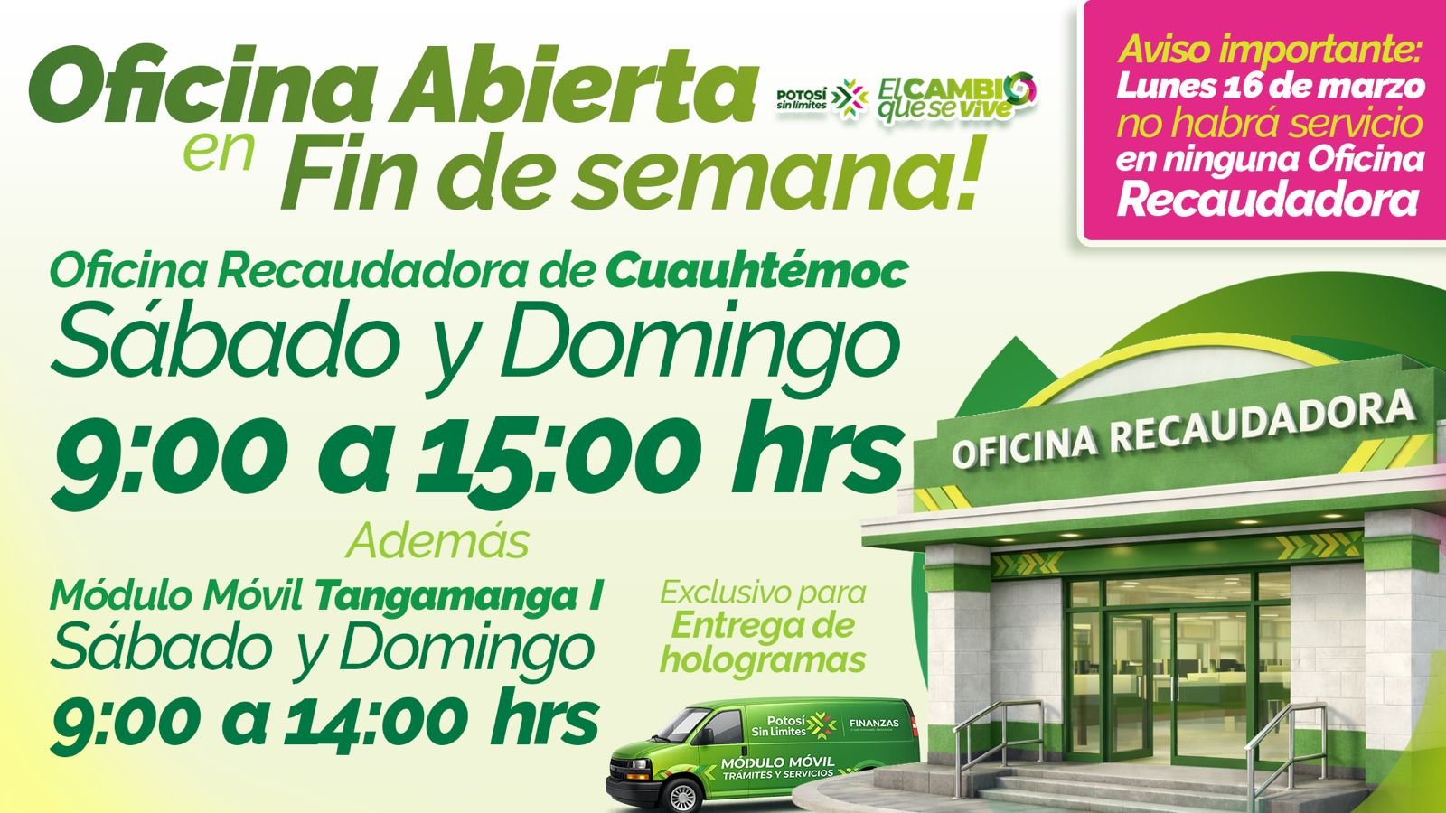 La Secretaría de Finanzas habilita atención en Cuauhtémoc y un módulo para entrega de hologramas en el parque Tangamanga I. El lunes no habrá servicio en las oficinas recaudadoras.