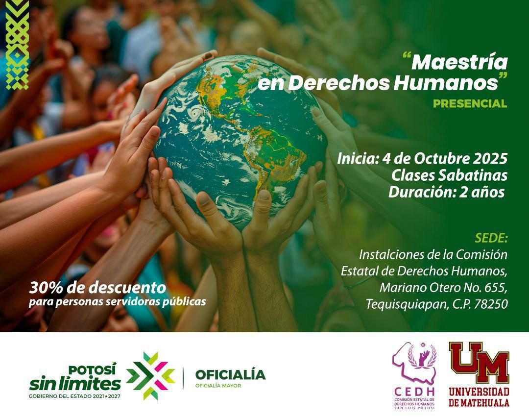 El Gobierno del Estado, a través de la Oficialía Mayor, convoca a las y los trabajadores del Estado a inscribirse en la Maestría en Derechos Humanos, la cual será impartida por la Universidad de Matehuala en coordinación con la Comisión Estatal de Derechos Humanos (CEDH).