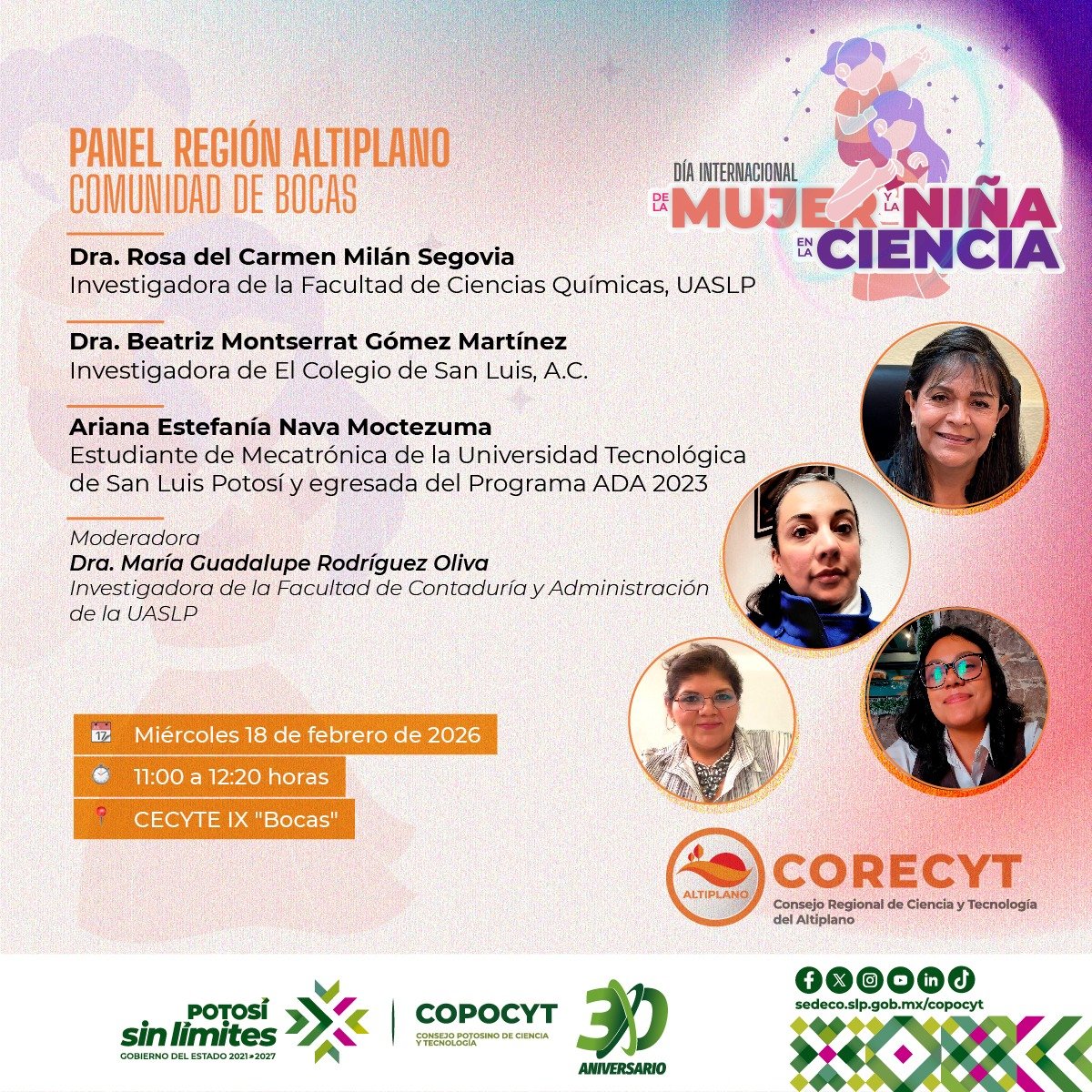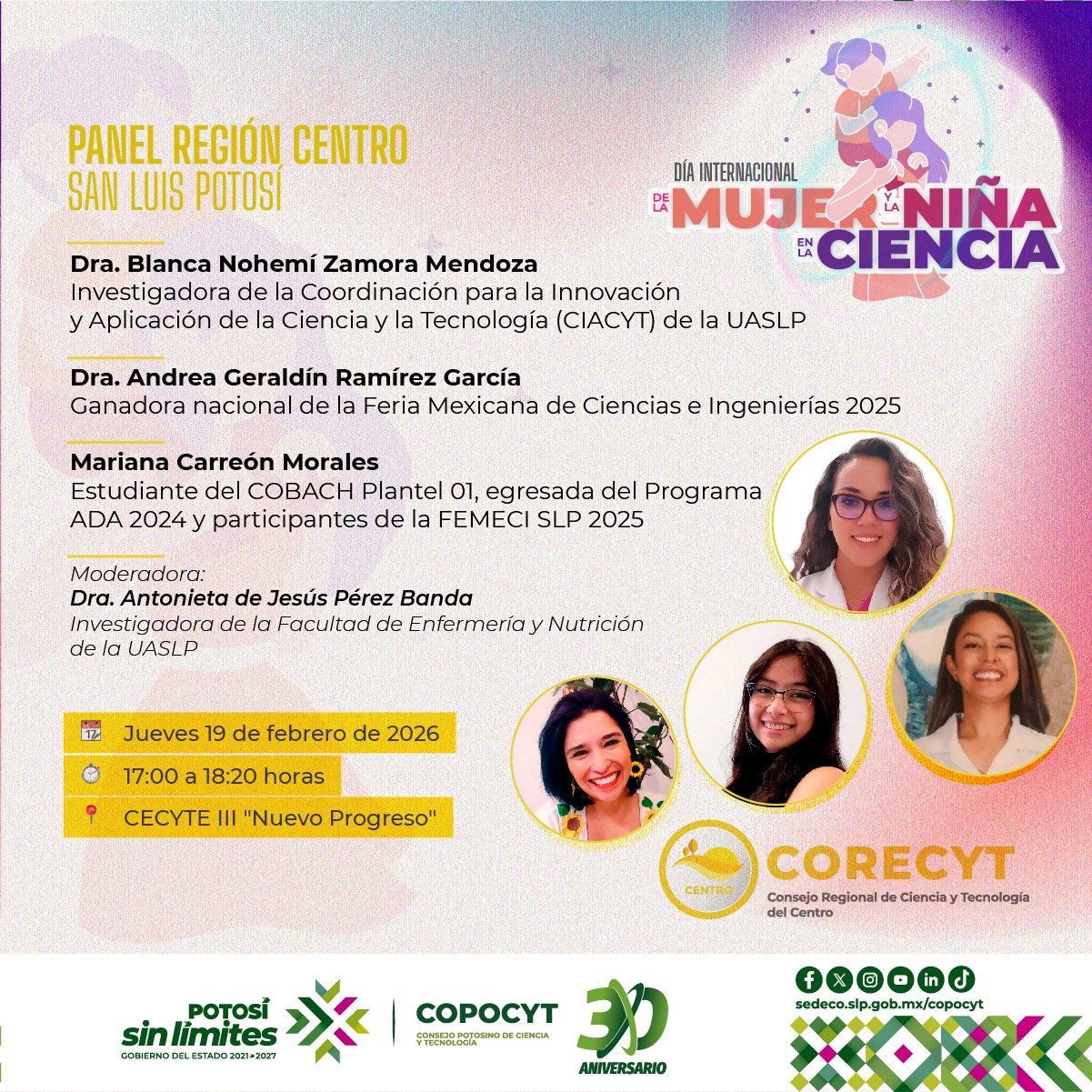 Por instrucción del Gobernador del Estado, Ricardo Gallardo Cardona, el Consejo Potosino de Ciencia y Tecnología (Copocyt) impulsa la visibilidad de las mujeres potosinas en la ciencia, llevando a cabo una serie de paneles regionales para promover sin límites la equidad de género, el acceso al conocimiento y el fortalecimiento de vocaciones científicas en todo el territorio Estatal, en el marco del Día Internacional de la Mujer y la Niña en la Ciencia.