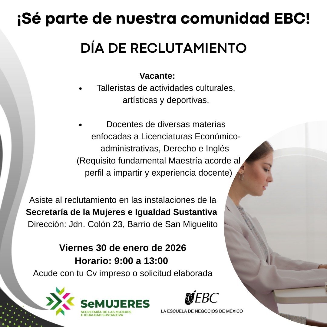 Este viernes 30 de enero, la Secretaría de las Mujeres e Igualdad Sustantiva (Semujeres), en coordinación con la Escuela Bancaria Comercial (EBC), realizará una jornada especial de reclutamiento dirigida a mujeres potosinas. El evento se realizará de 9:00 a 13:00 horas en el patio central de la dependencia, ubicado en Jardín Colón número 23, en el barrio de San Miguelito.