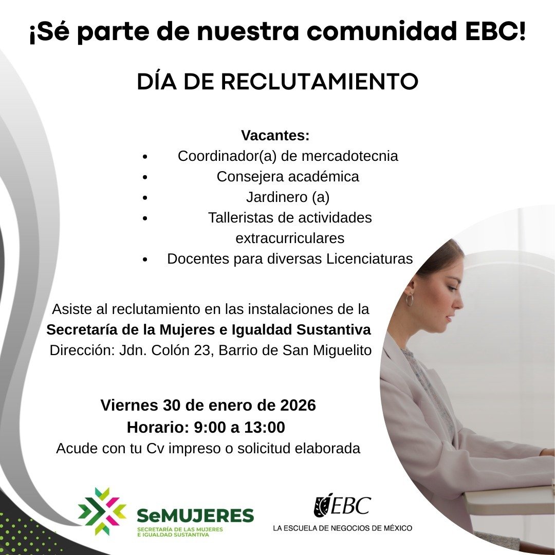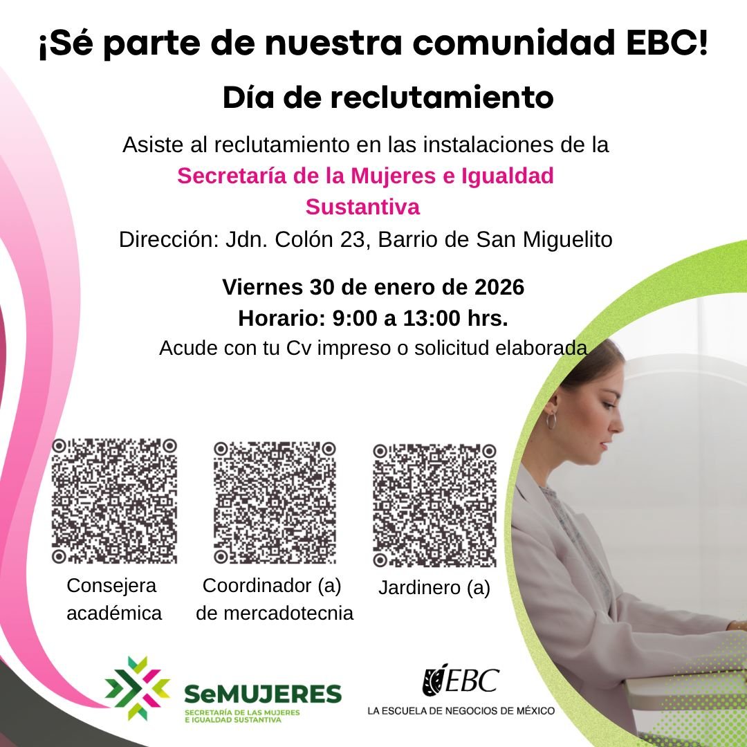 Este viernes 30 de enero, la Secretaría de las Mujeres e Igualdad Sustantiva (Semujeres), en coordinación con la Escuela Bancaria Comercial (EBC), realizará una jornada especial de reclutamiento dirigida a mujeres potosinas. El evento se realizará de 9:00 a 13:00 horas en el patio central de la dependencia, ubicado en Jardín Colón número 23, en el barrio de San Miguelito.