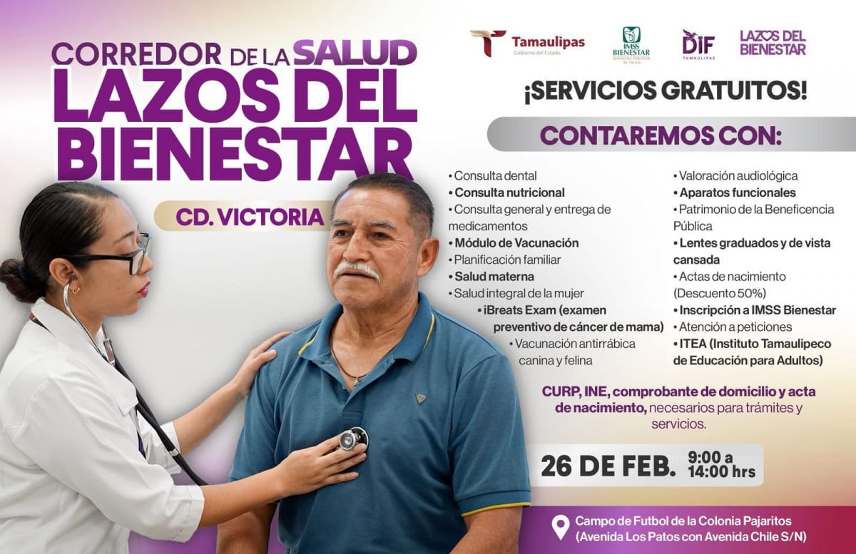 Febrero 25 de 2026 Ciudad Victoria, Tamaulipas.- El Gobierno del Estado y el Sistema DIF Tamaulipas, presidido por la doctora María de Villarreal, invitan a las familias victorenses al Segundo Corredor de la Salud “Lazos del Bienestar”, que se llevará a cabo el jueves 26 de febrero, a partir de las 9:00 de la mañana, en el campo de fútbol de la colonia Pajaritos, ubicado en la avenida Los Patos con avenida Chile, en el oriente de la capital. El Corredor de la Salud es una iniciativa que forma parte del programa Lazos del Bienestar, una estrategia de asistencia social, participación y colaboración comunitaria que se implementa en 12 polígonos de atención prioritaria en 10 municipios de Tamaulipas, entre ellos Victoria, que cuenta con los polígonos Echeverría y Pajaritos. Durante esta actividad se brindarán consultas médicas generales, dentales y nutricionales totalmente gratuitas; módulo de vacunación; atención en salud materna y examen preventivo de cáncer de mama. Además, se entregarán aparatos auditivos, lentes graduados y otros apoyos funcionales que contribuyen al bienestar de las personas. También se ofrecerá orientación y trámites como actas de nacimiento con descuento, inscripción al IMSS Bienestar y servicios de atención ciudadana, facilitando el acceso a derechos y programas sociales. Los Corredores de la Salud representan una iniciativa participativa que une a sociedad y gobierno para transformar comunidades desde la cercanía, el trabajo colaborativo y la atención directa en territorio, garantizando que los servicios lleguen a cada familia. Con acciones como esta, el Gobierno del Estado y el DIF Tamaulipas refrendan su compromiso de promover la prevención, el cuidado de la salud y el bienestar integral de la población tamaulipeca.