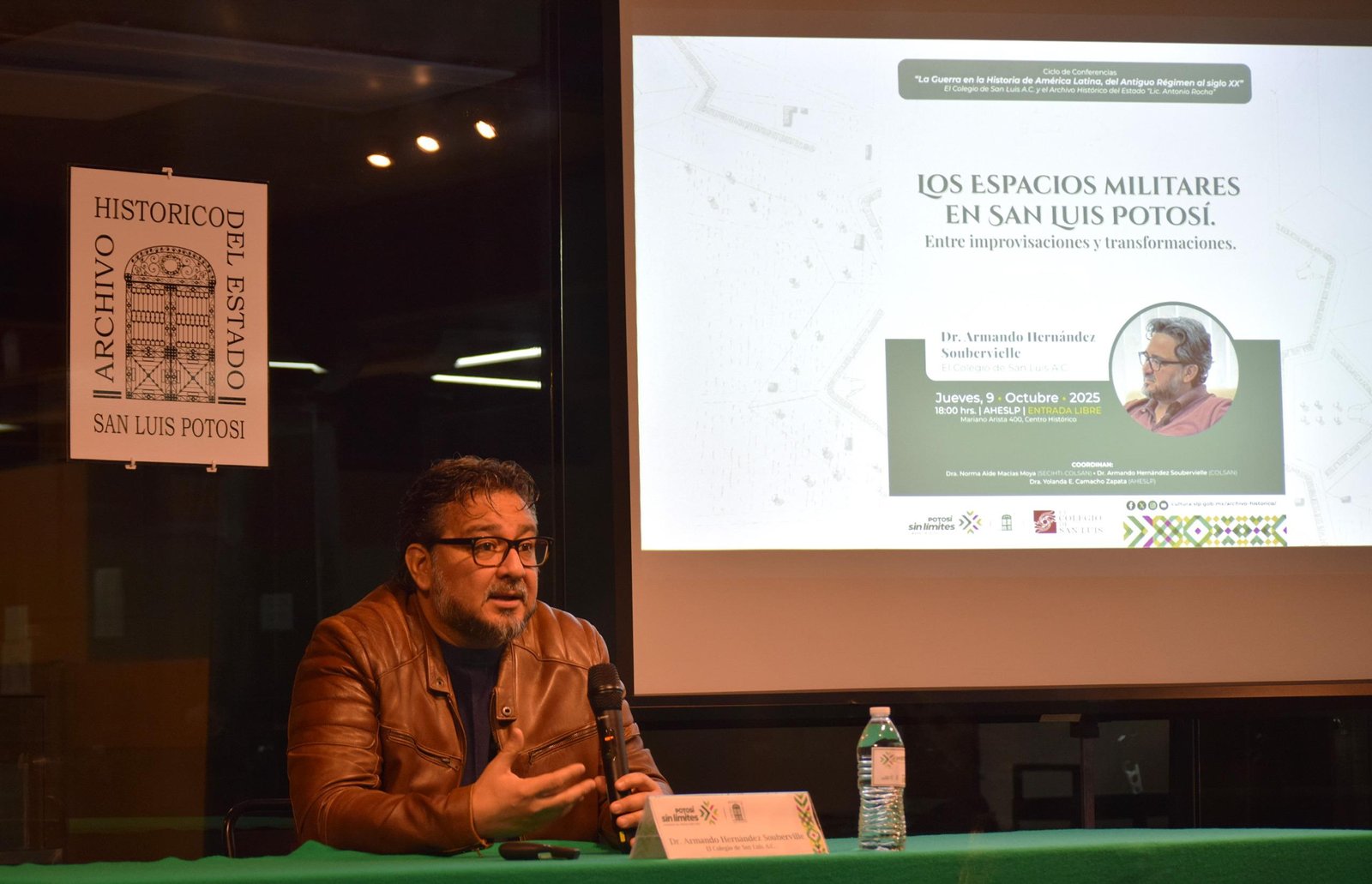 Para fortalecer sin límites la difusión del patrimonio documental y cultural, el Archivo Histórico del Estado, en colaboración con el Colegio de San Luis, realizó la conferencia “Los espacios militares en San Luis Potosí. Entre improvisaciones y transformaciones”, a cargo de Armando Hernández Soubervielle.