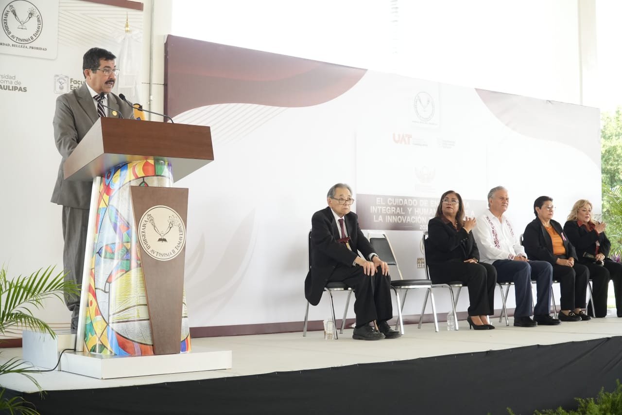 En la ceremonia, dio la bienvenida al Dr. Alberto Rhi Sausi Galindo, hijo del director fundador de la antes Escuela de Enfermería y Obstetricia de Ciudad Victoria, Dr. Alberto Rhi Sausi, destacando la importancia de recordar, en este acto, la historia y trayectoria de esta institución que nació ante la necesidad de formar especialistas comprometidos con el cuidado de la vida y la salud.