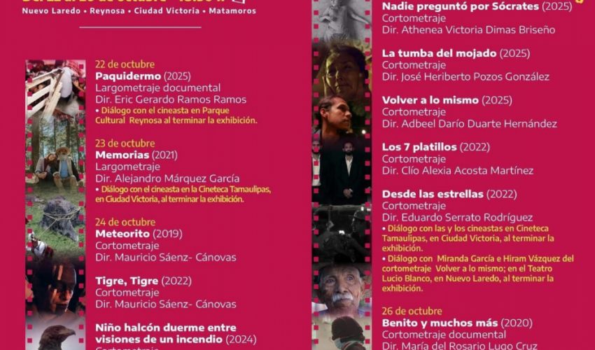 Finalmente, Sharanny Rashell Pérez y Jesús Manuel Zuñiga Ponce platicarán en el MACT sobre su proceso el 26 de octubre. La cartelera completa del Ciclo de Cine Tamaulipeco está disponible en las redes sociales del Instituto Tamaulipeco para la Cultura y las Artes. Programación: 22 de octubre Paquidermo (2025) Largometraje documental Dir. Eric Gerardo Ramos Ramos 23 de octubre Memorias (2021) Largometraje Dir. Alejandro Márquez García 24 de octubre Meteorito (2019) Cortometraje Dir. Mauricio Sáenz- Cánovas Tigre, Tigre (2022) Cortometraje Dir. Mauricio Sáenz- Cánovas Niño halcón duerme entre visiones de un incendio (2024) Cortometraje Dir. Mauricio Sáenz- Cánovas Pesadumbre (2025) Cortometraje documental Dir. Jorge Enrique González Venegas 25 de octubre Nadie preguntó por Sócrates (2025) Cortometraje Dir. Athenea Victoria Dimas Briseño La tumba del mojado (2025) Cortometraje Dir. José Heriberto Pozos González Volver a lo mismo (2025) Cortometraje Dir. Adbeel Darío Duarte Hernández Los 7 platillos (2022) Cortometraje Dir. Clío Alexia Acosta Martínez Desde las estrellas (2022) Cortometraje Dir. Eduardo Serrato Rodríguez 26 de octubre Benito y muchos más (2020) Cortometraje documental Dir. María del Rosario Lugo Cruz S.D.R. Ser De Reynosa (2021) Cortometraje documental Dir. Jesús Manuel Zuñiga Ponce Bailarín y punto (2017) Cortometraje documental Dir. Sharanny Rashell Pérez Cárdenas A través del barro (2019) Cortometraje documental