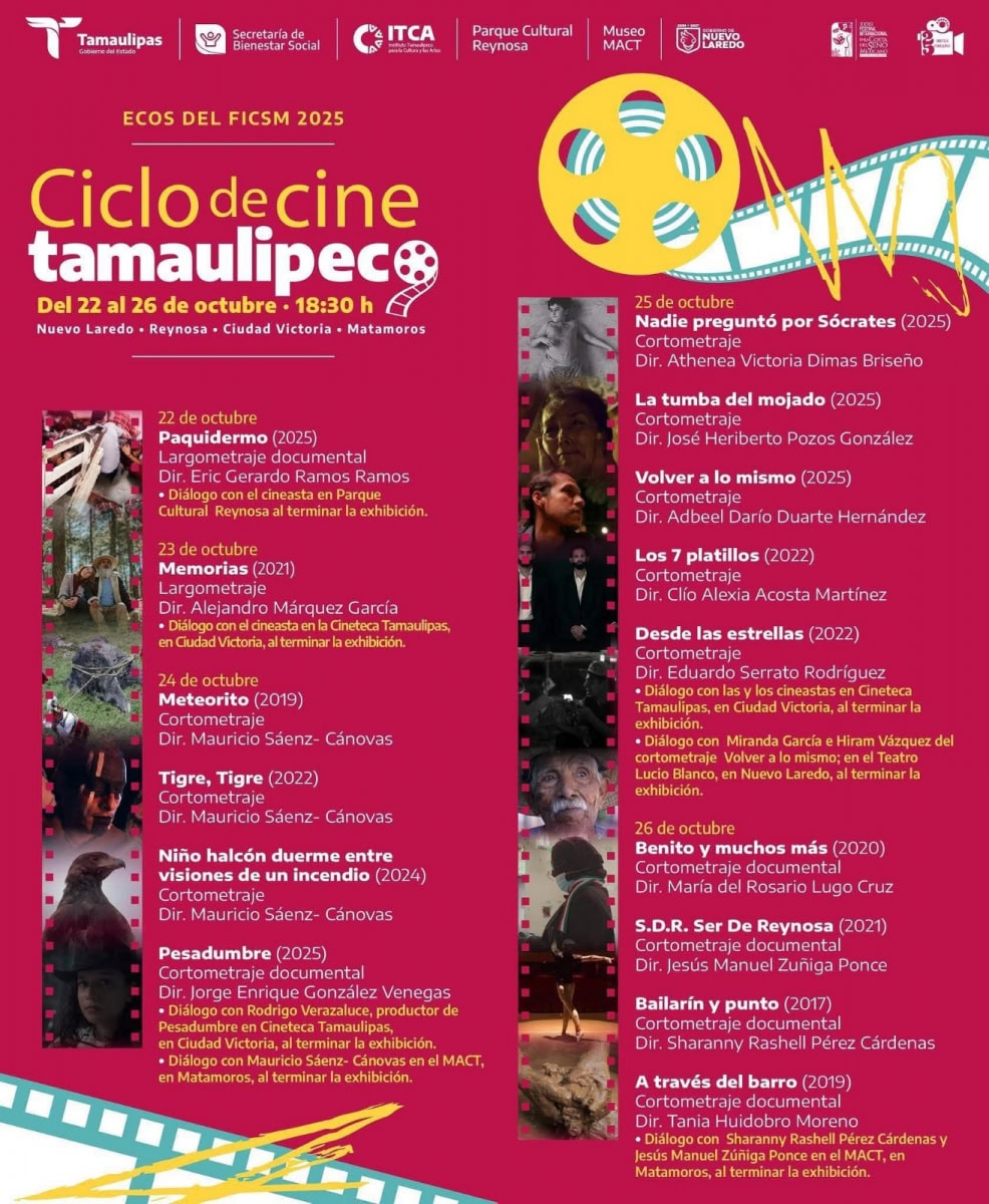 Finalmente, Sharanny Rashell Pérez y Jesús Manuel Zuñiga Ponce platicarán en el MACT sobre su proceso el 26 de octubre. La cartelera completa del Ciclo de Cine Tamaulipeco está disponible en las redes sociales del Instituto Tamaulipeco para la Cultura y las Artes. Programación: 22 de octubre Paquidermo (2025) Largometraje documental Dir. Eric Gerardo Ramos Ramos 23 de octubre Memorias (2021) Largometraje Dir. Alejandro Márquez García 24 de octubre Meteorito (2019) Cortometraje Dir. Mauricio Sáenz- Cánovas Tigre, Tigre (2022) Cortometraje Dir. Mauricio Sáenz- Cánovas Niño halcón duerme entre visiones de un incendio (2024) Cortometraje Dir. Mauricio Sáenz- Cánovas Pesadumbre (2025) Cortometraje documental Dir. Jorge Enrique González Venegas 25 de octubre Nadie preguntó por Sócrates (2025) Cortometraje Dir. Athenea Victoria Dimas Briseño La tumba del mojado (2025) Cortometraje Dir. José Heriberto Pozos González Volver a lo mismo (2025) Cortometraje Dir. Adbeel Darío Duarte Hernández Los 7 platillos (2022) Cortometraje Dir. Clío Alexia Acosta Martínez Desde las estrellas (2022) Cortometraje Dir. Eduardo Serrato Rodríguez 26 de octubre Benito y muchos más (2020) Cortometraje documental Dir. María del Rosario Lugo Cruz S.D.R. Ser De Reynosa (2021) Cortometraje documental Dir. Jesús Manuel Zuñiga Ponce Bailarín y punto (2017) Cortometraje documental Dir. Sharanny Rashell Pérez Cárdenas A través del barro (2019) Cortometraje documental