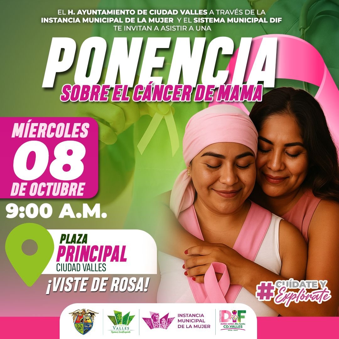 La Instancia Municipal de la Mujer, del H. Ayuntamiento de Ciudad Valles, a cargo de la Mtra. Rebeca Terán Guevara, invita a todas las mujeres vallenses a participar en la ponencia sobre el cáncer de mama, así como en las actividades que se realizarán con motivo del Mes de Sensibilización sobre esta enfermedad.