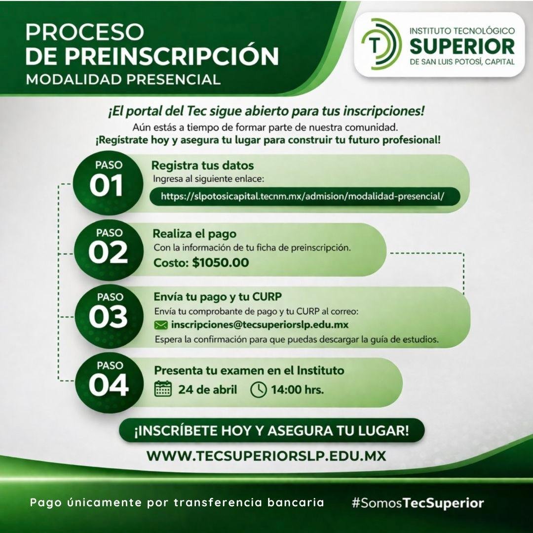 El proceso de registro se realiza en cuatro pasos: ingresar a slpotosicapital.tecnm.mx/admision/modalidad-presencial, efectuar el pago de la ficha, enviar la ficha de pago y la CURP al correo electrónico inscripciones@tecsuperiorslp.edu.mx y acudir a las instalaciones del plantel el día del examen. Además, el Instituto brinda atención personalizada a través de WhatsApp al 4445722239, donde se orienta a las y los aspirantes durante todo el periodo vacacional, facilitando cada etapa del trámite.