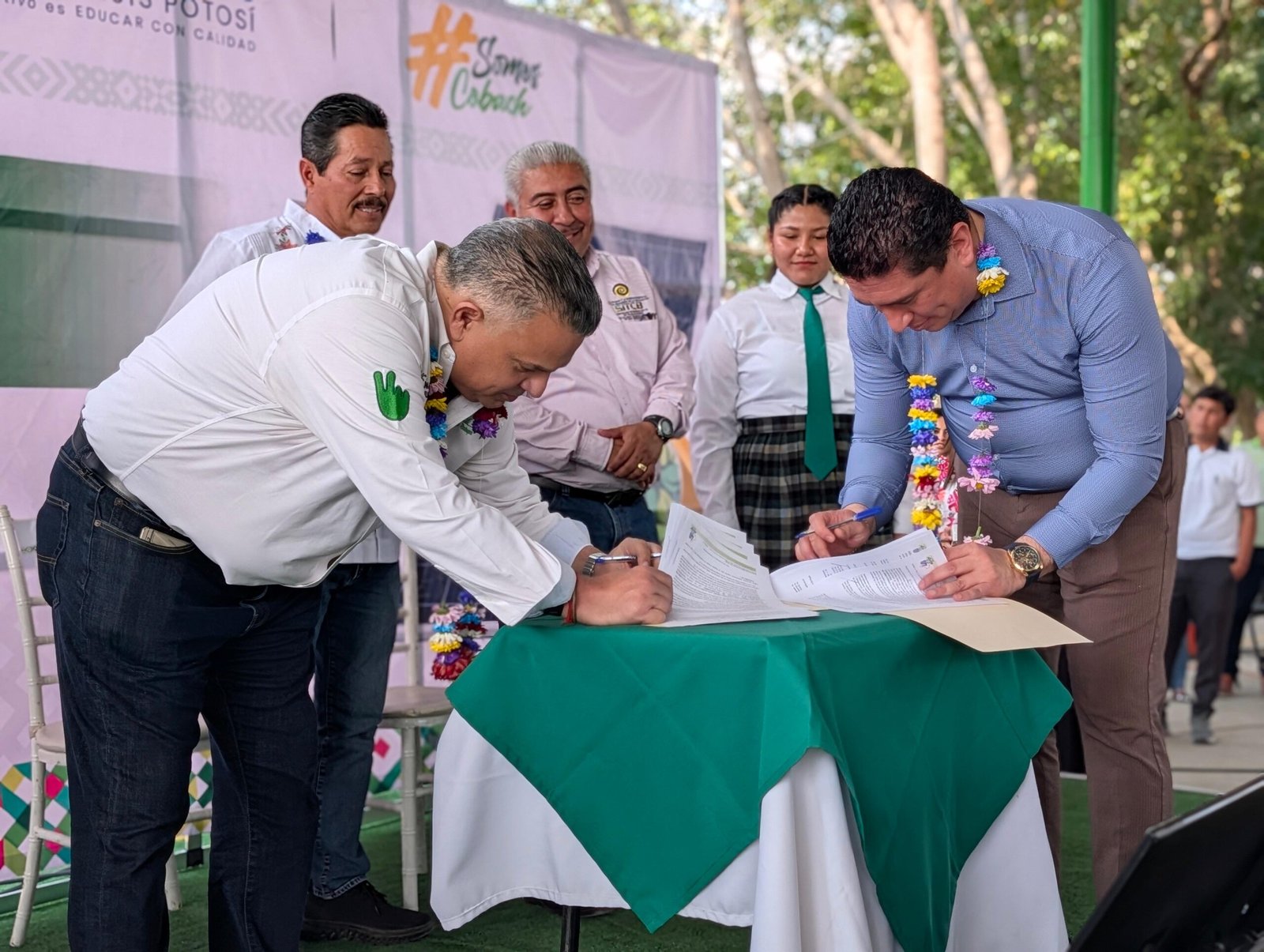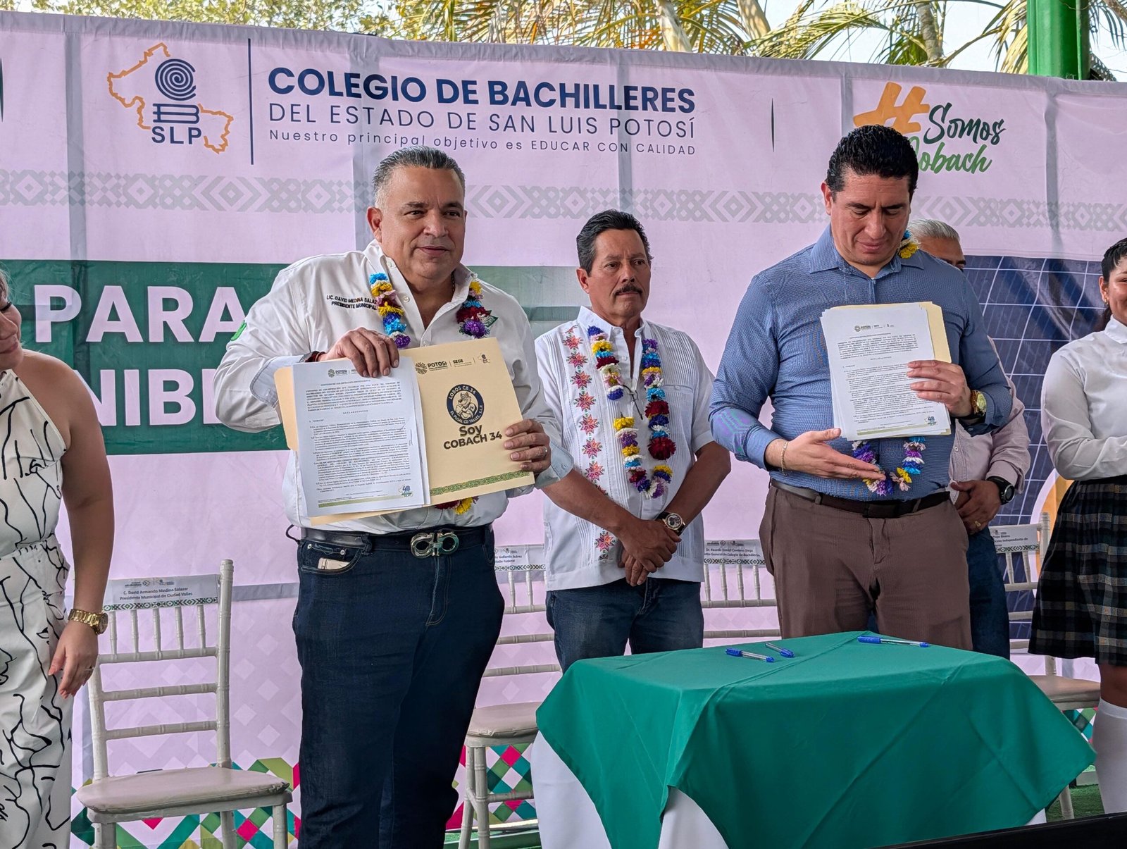 CIUDAD VALLES, S.L.P. – Este jueves, 12 de febrero, se dio un paso firme a favor de la educación con la firma del convenio para la instalación de paneles solares en el Colegio de Bachilleres Plantel 34, ubicado en la Delegación Pujal, una acción que impactará directamente en mejores condiciones para 205 alumnas y alumnos, personal docente y administrativo, quienes contarán con espacios más dignos y adecuados para el aprendizaje.