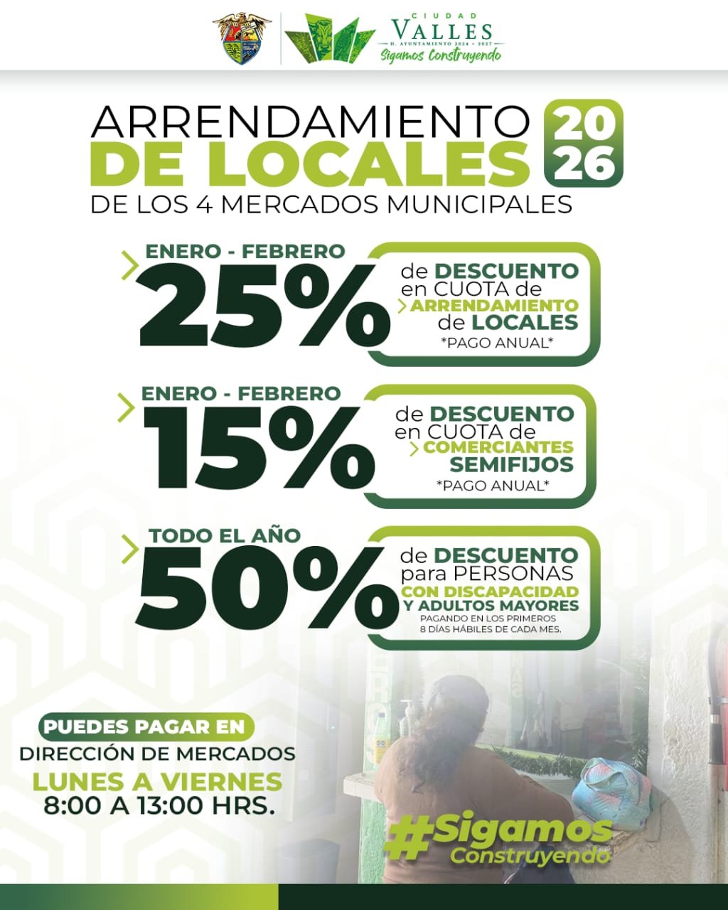 CIUDAD VALLES, S.L.P. – El H. Ayuntamiento de Ciudad Valles, a través de la Dirección de Mercados, exhorta a los locatarios, así como a los comerciantes semifijos de los cuatro mercados del municipio, a aprovechar los descuentos vigentes del 25% y 15%, respectivamente, que se aplicarán durante los meses de enero y febrero en el pago anual de la Cuota de Arrendamiento de locales.