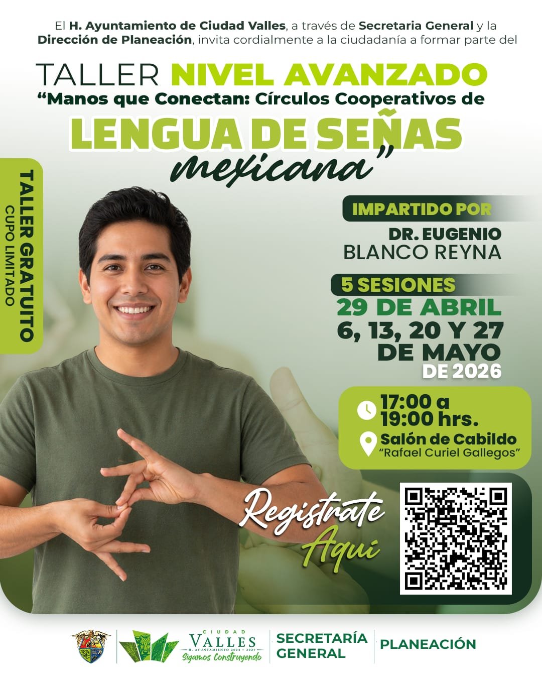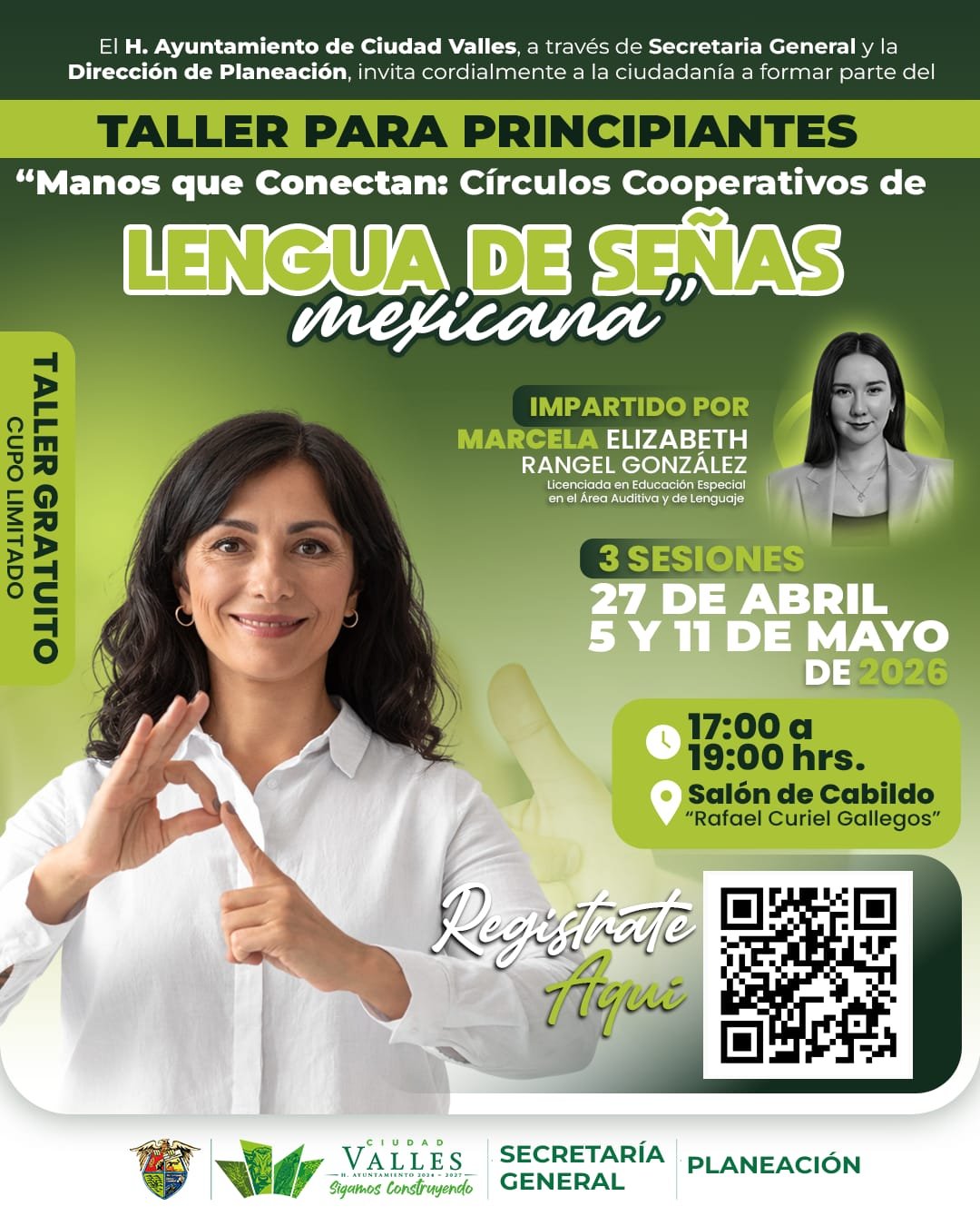 CIUDAD VALLES, S.L.P. – Dando continuidad a las acciones que promueven la inclusión en el municipio, el H. Ayuntamiento de Ciudad Valles, a través de la Secretaría General y la Dirección de Planeación, invita a la ciudadanía a formar parte de los talleres “Manos que Conectan: Círculos Cooperativos de Lengua de Señas Mexicana”, en sus niveles básico y avanzado, con el propósito de fortalecer la comunicación con la comunidad sorda y construir una sociedad más incluyente.