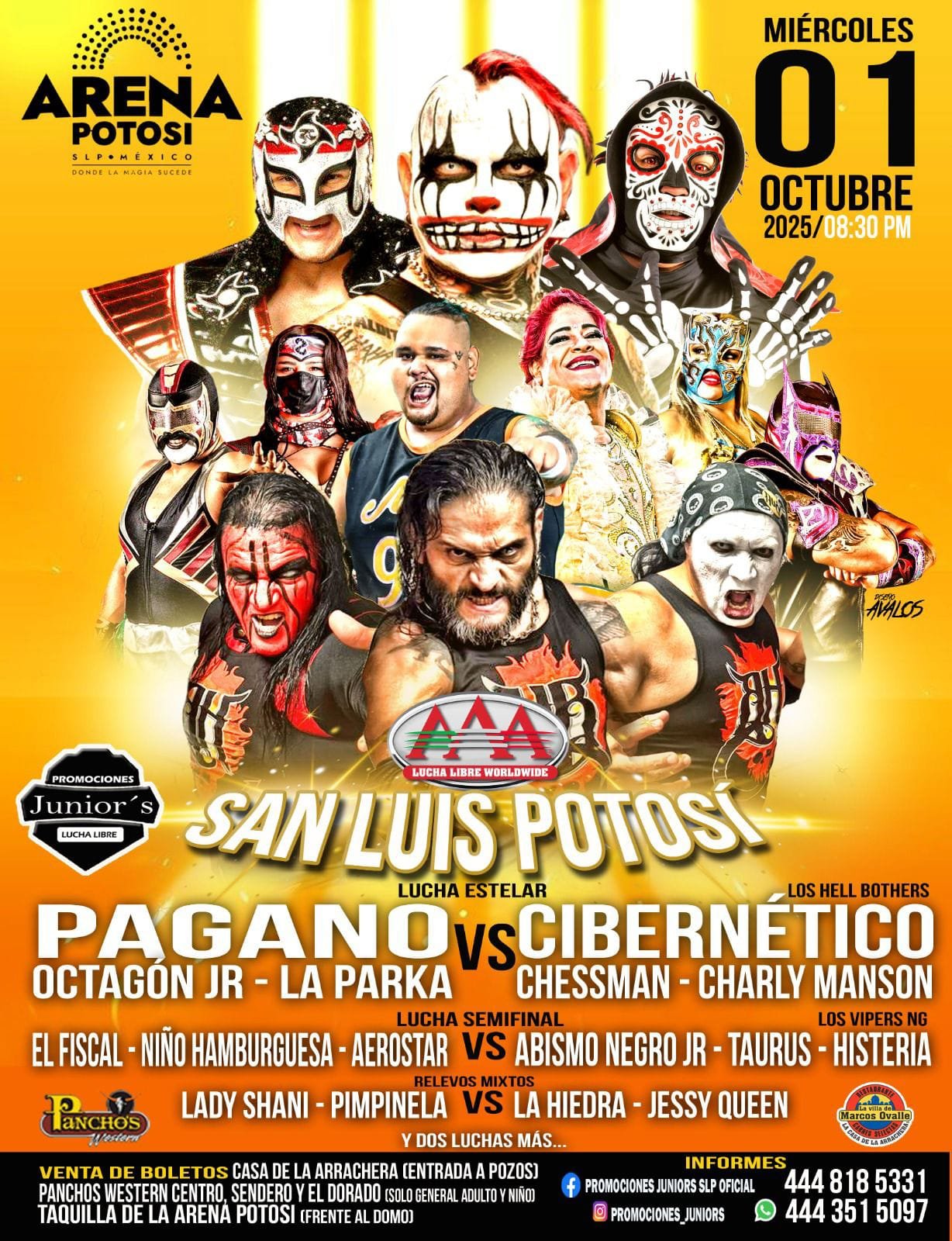 Este miércoles 1 de octubre de 2025, la emoción vuelve a estallar en la majestuosa Arena Potosí con el regreso de La Lucha Libre AAA, en un espectáculo lleno de adrenalina, impacto y emoción sin límites.