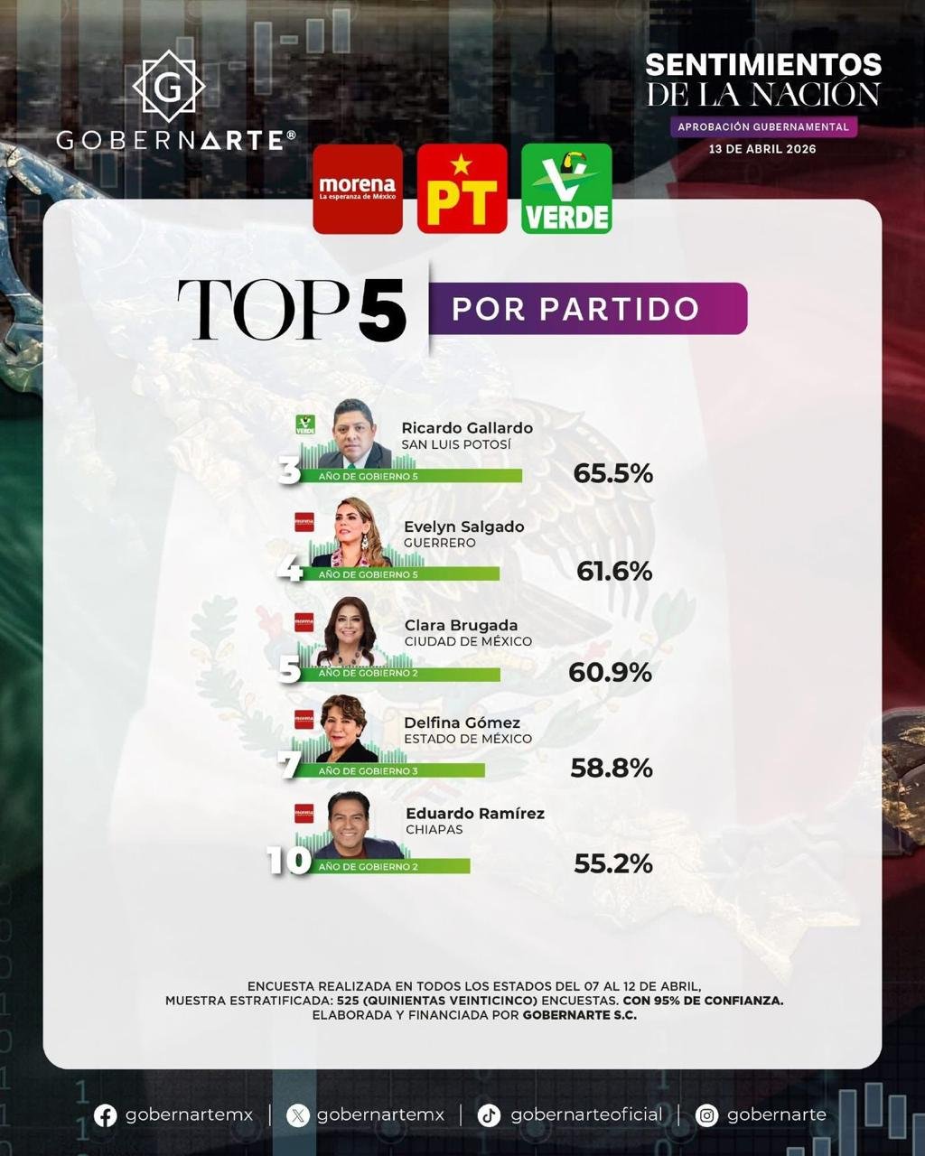 El Gobernador de San Luis Potosí, Ricardo Gallardo Cardona, ratifica el sólido respaldo popular que define su gestión al posicionarse como el líder indiscutible entre los gobernantes estatales aliados de la Cuarta Transformación, superando incluso las evaluaciones obtenidas por las titulares de la Ciudad de México y Guerrero; ocupando, además, el tercer lugar en aprobación ciudadana entre los 32 gobernadores del país.