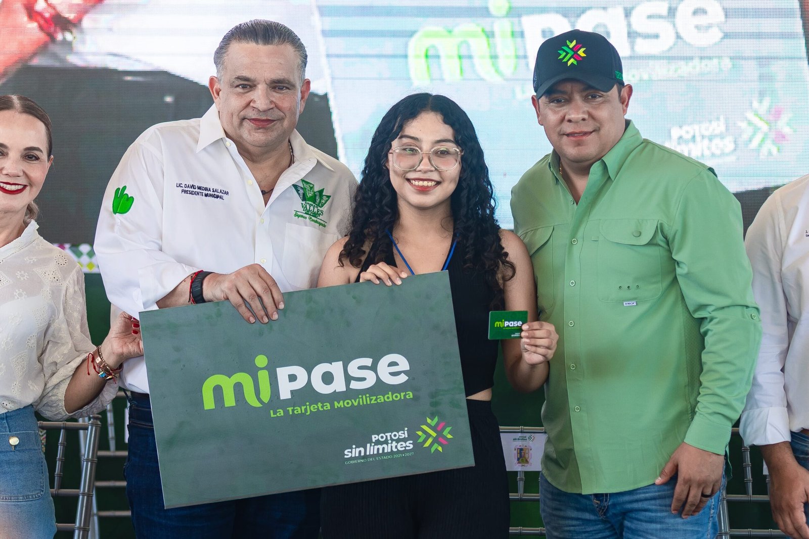 CIUDAD VALLES, S.L.P. – Como parte de la gira de trabajo del Gobernador del Estado, Ricardo Gallardo Cardona, este jueves el Presidente Municipal de Ciudad Valles, David Armando Medina Salazar, acompañó la entrega de más de mil tarjetas Mi Pase en el Centro Deportivo Gómez Morín, dentro del Programa de Apoyo y Subsidio a Estudiantes, con la que las y los beneficiarios podrán acceder a más de 40 viajes sin costo al mes en apoyo a su economía. El evento reunió a alumnas y alumnos de nivel medio superior y superior de diversas instituciones educativas.