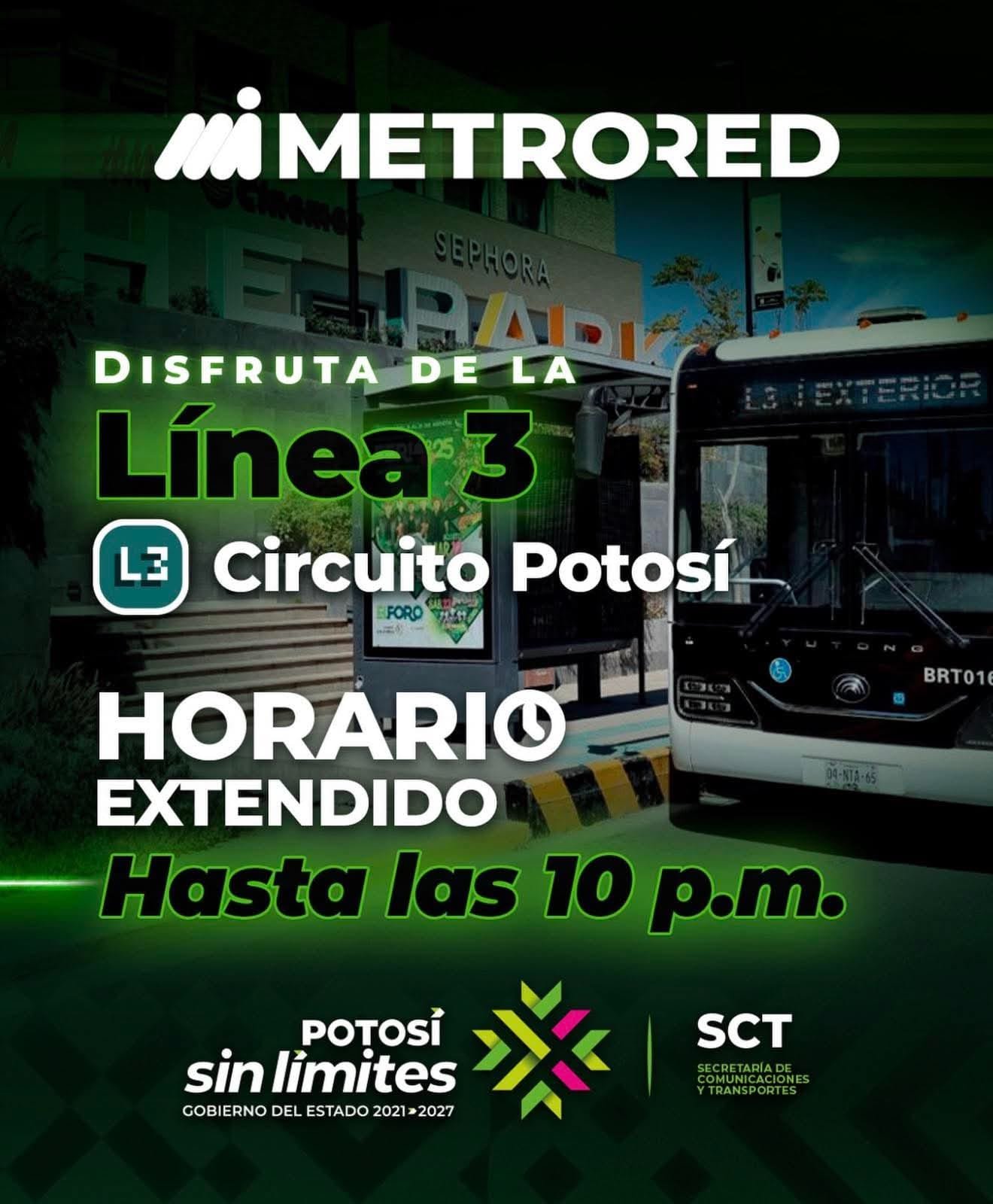 Como parte de la política que impulsa una movilidad sin límites el Gobierno del Estado de San Luis Potosí amplió el horario de operación de la Línea 3 de MetroRed – Circuito Potosí, que ahora ofrecerá servicio hasta las 22:00 horas, facilitando el traslado seguro de personas que acuden o laboran en diferentes zonas comerciales como plaza San Luis, The Park, entre otras.
