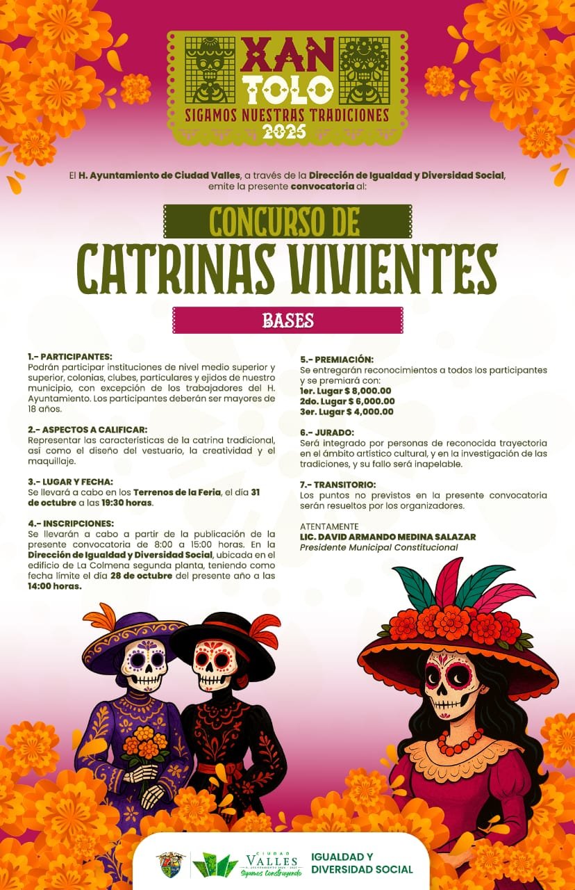 CIUDAD VALLES, S.L.P.- El H. Ayuntamiento de Ciudad Valles, a través de la Dirección de Diversidad e Igualdad Social, que dirige Guillermo Guerrero Vargas, hace una cordial invitación a la ciudadanía en general para que participe en el tradicional concurso de Catrinas Vivientes, que se llevará a cabo en los Terrenos de la Feria el próximo 31 de octubre, en punto de las 19:30 horas.