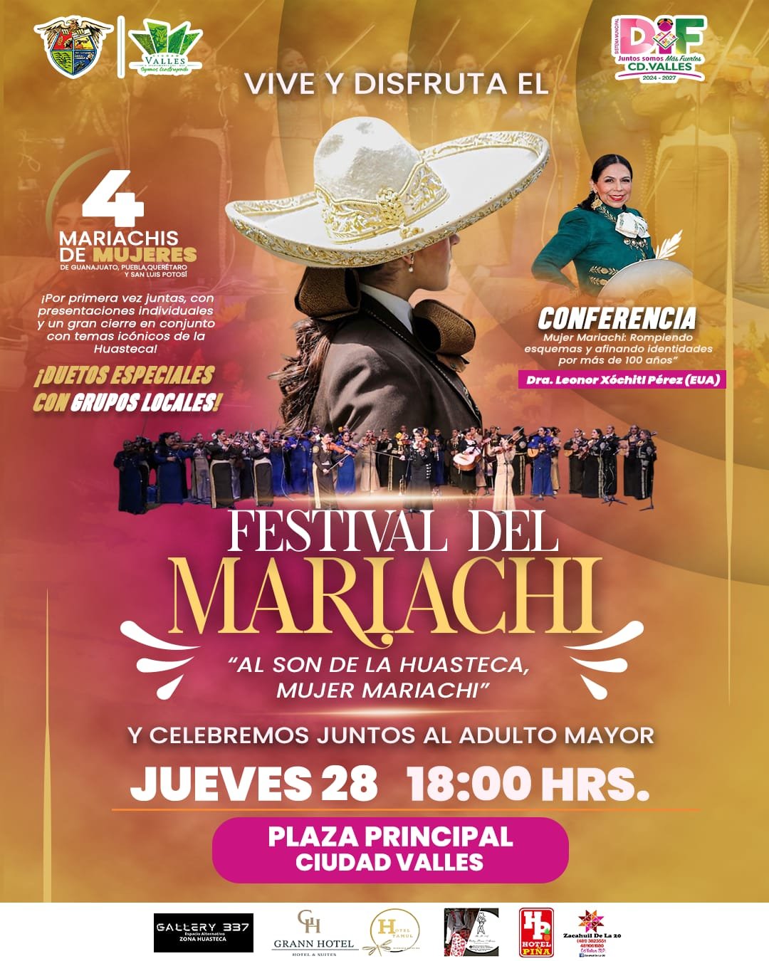 Prepárate para vivir una noche llena de música, orgullo y tradición en el Festival del Mariachi “Al Son de la Huasteca, Mujer Mariachi”, este jueves 28 de agosto a las 6 pm en la Plaza Principal, en el marco del Día del Adulto Mayor.